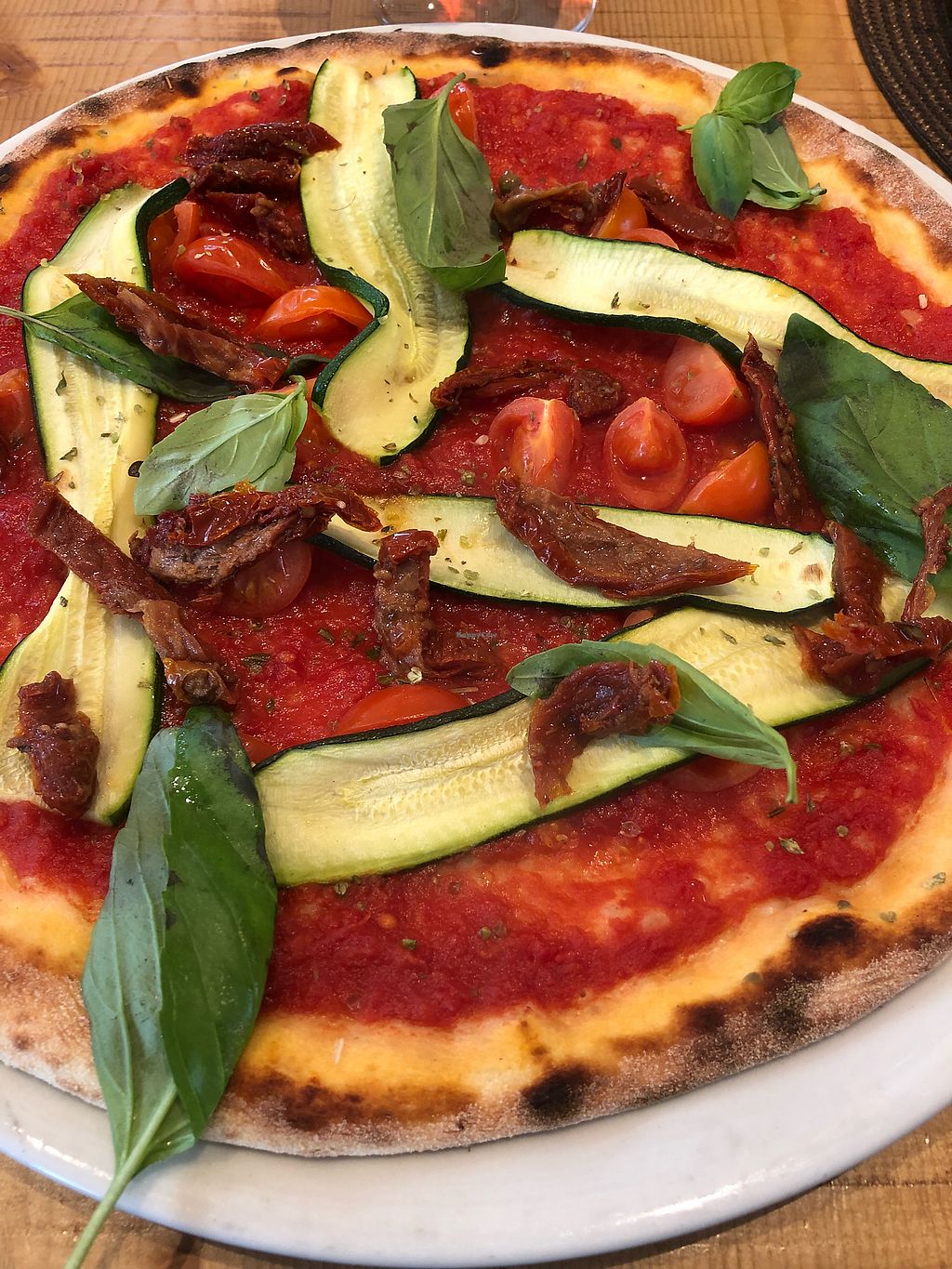 Pizza Finferlino mit Pfifferlingen, Cocktailtomaten, Basilikum, Zwiebe…