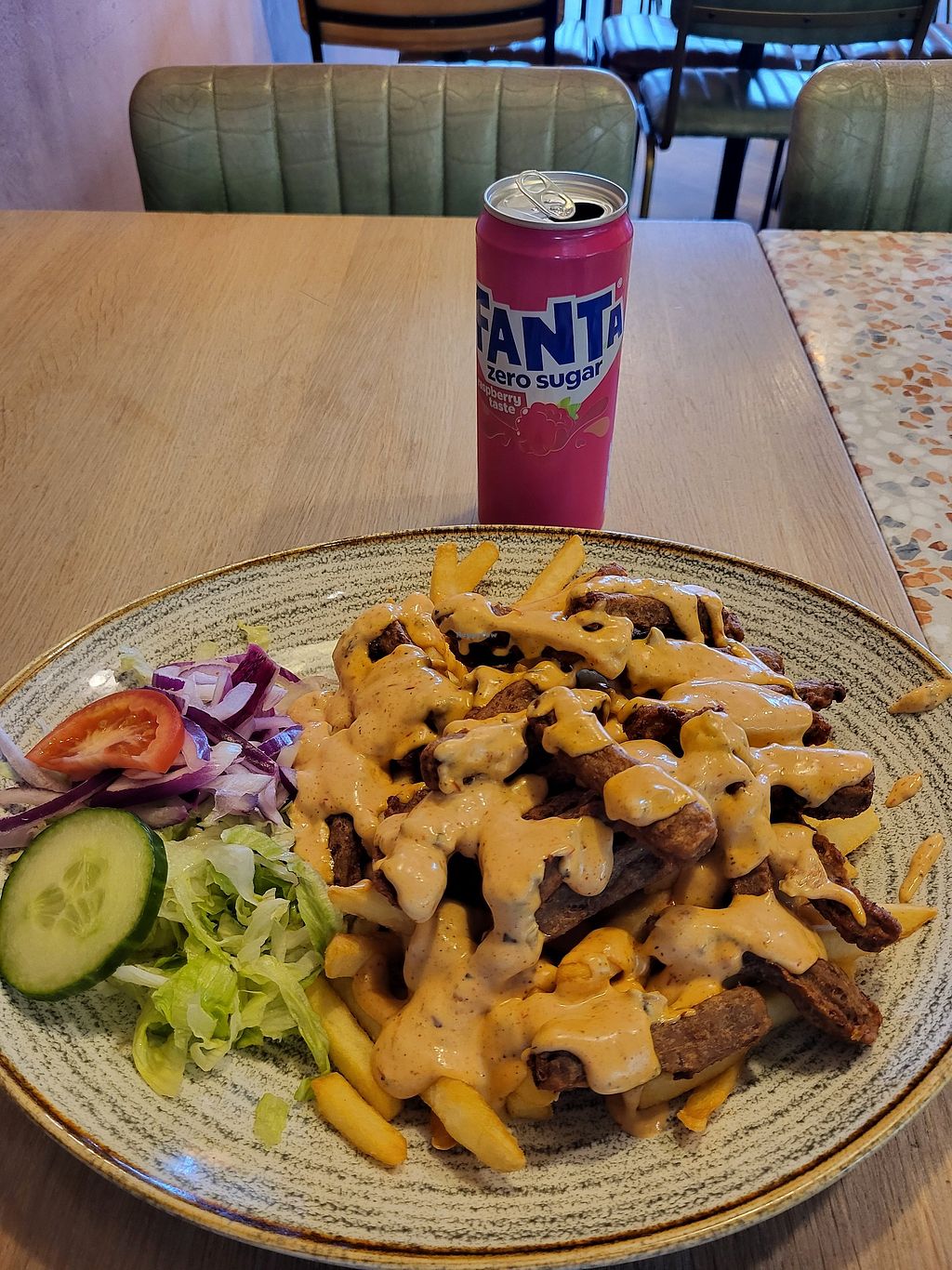 Serves meat, vegan options available. Swedish fast food-style pizzeria. Vegan choices are labeled and include vegan kebab pizza, kebab wrap, and fries. Please note that many businesses in Sweden are cashless. Open Mon-Sun 11:00-21:00.