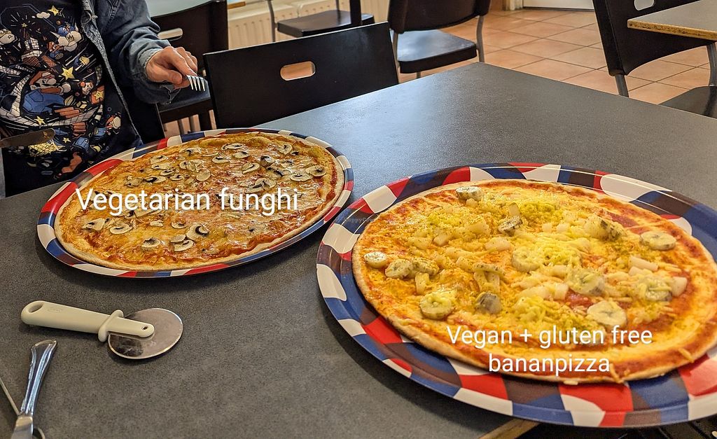 Serves meat, vegan options available. Pizzeria next to the station where vegetarian pizzas can be made vegan with plant-based cheese. Please note that many businesses in Sweden are cashless. Open Mon-Sun 12:00-21:00.