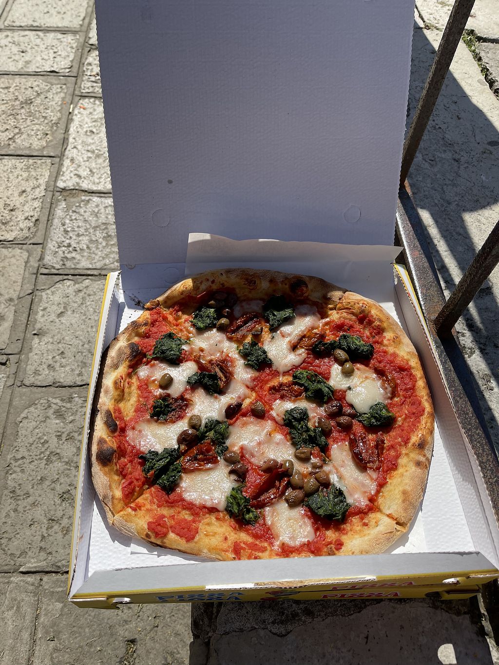 Vegan pizza with spinach sundries tomatoes and cheese