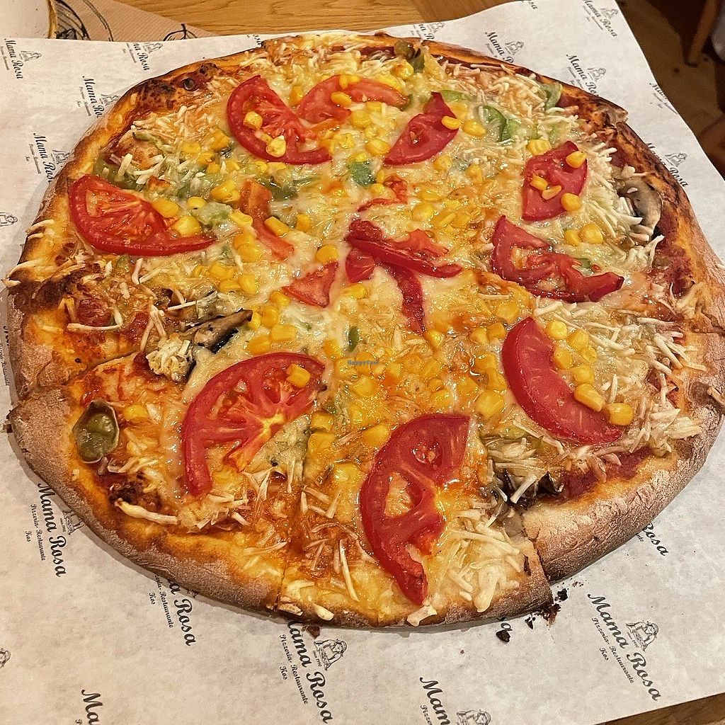Large pizza with vegan cheese tomato, corn, paprika, mushrooms