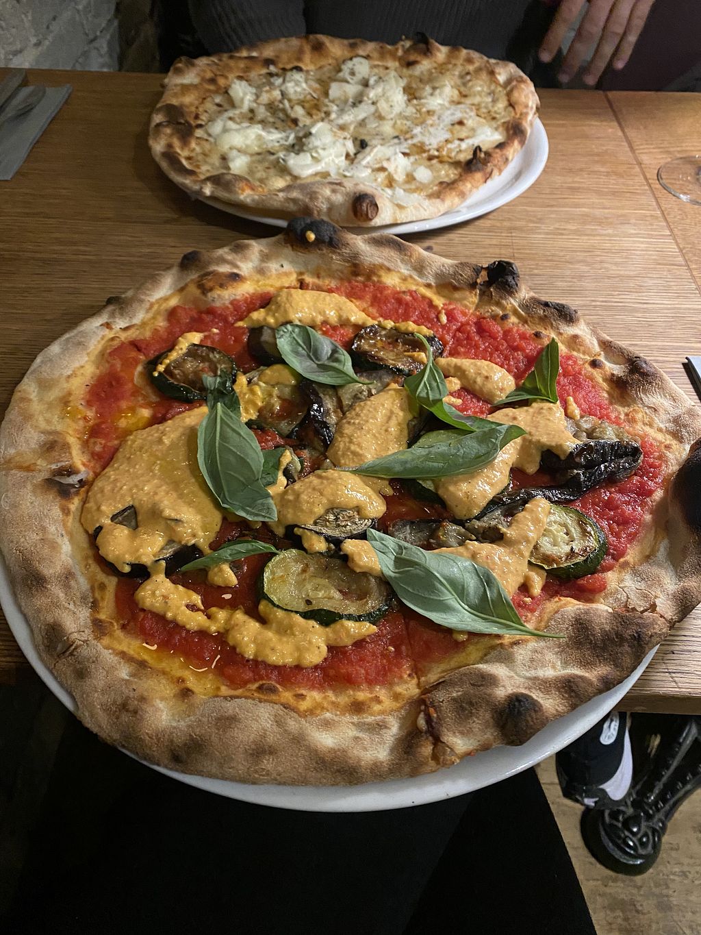 Vegan pizza with basil, aubergine and various veggies