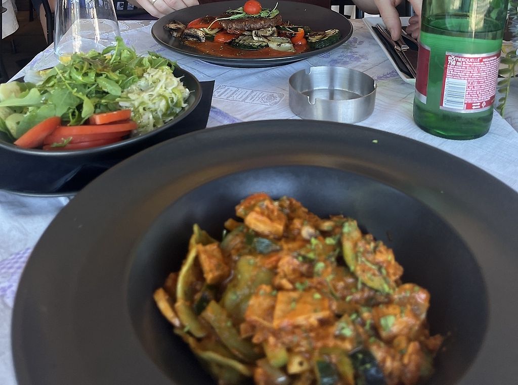 We had the vegan ravioli and the vegan patty. Mixed salad and pizza bread as a side. It was delicious. There is also a vegan risotto in the menu. The sea view is nice. There is a parking opportunity at the habour (fees).