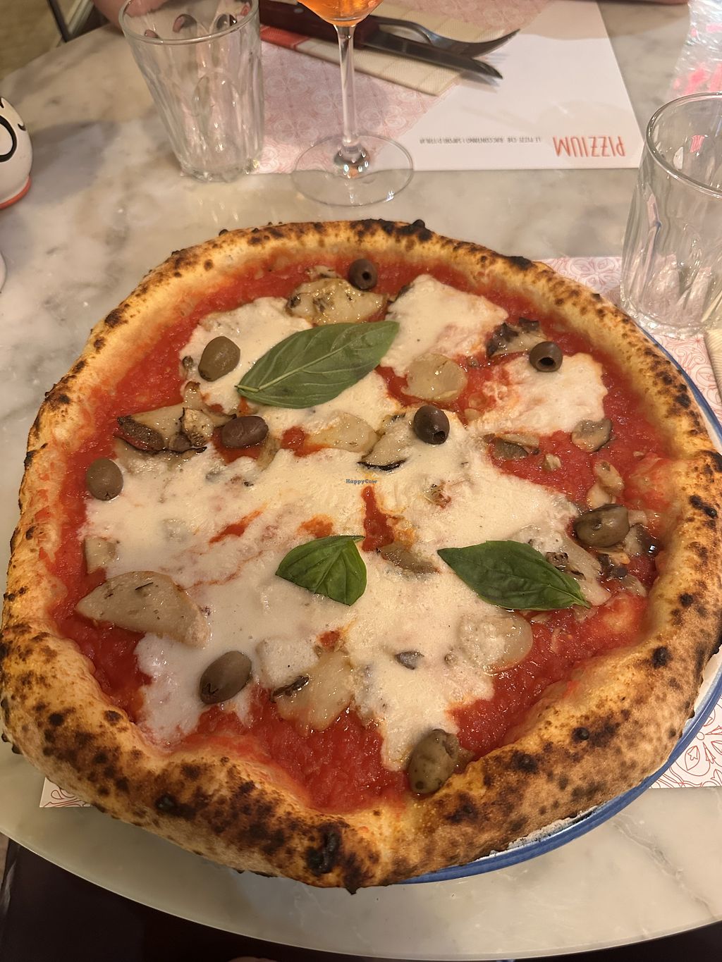 Good Neapolitan style pizza, with vegan mozzarella. The mozzarella was way better than the typical vegan cheese that tends to be sticky. Also there was a thick layer of very good quality tomato sauce.