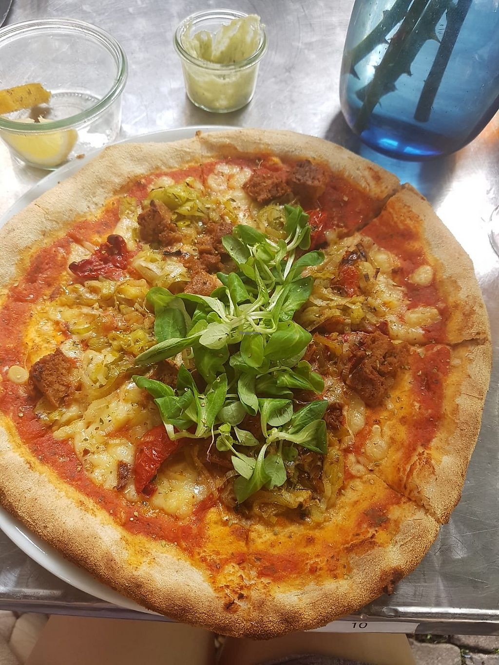 Pizza with seitan, olives and leeks