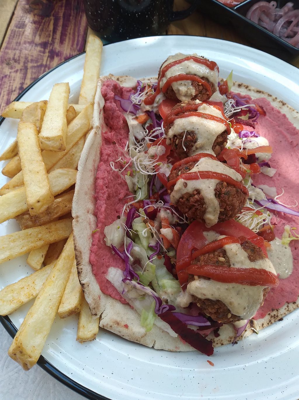 We had the Athena wrap and falafel 🥙 wrap with fries. The vegan tzatziki sauce and sprouts were refreshing on a hot day 🥵 I love the zero waste commitment 🌍