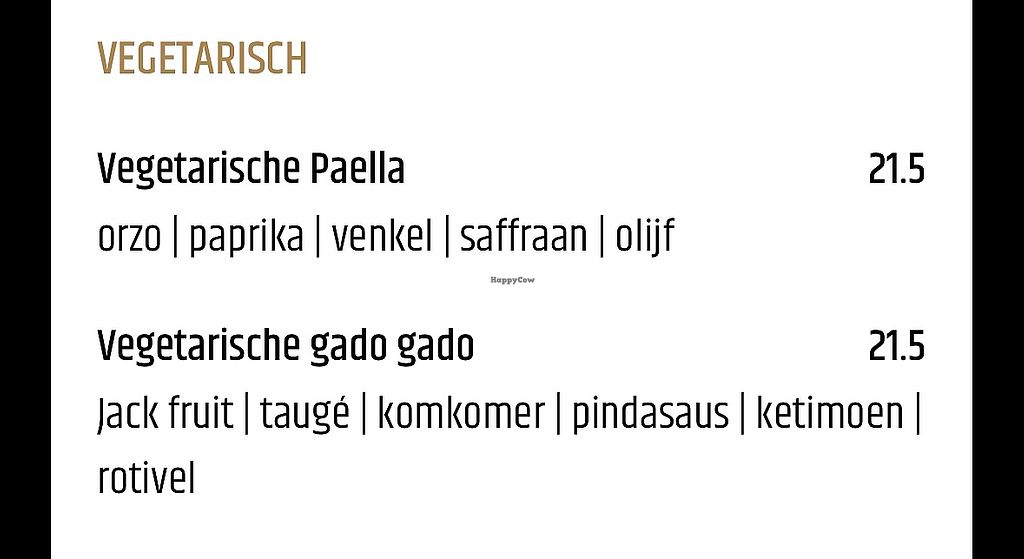 Lacto Ovo Beer/Wine Take-out Honey Non-veg Serves meat, vegan options available. Restaurant offering vegan paella and gado gado. Open Mon-Sun 10:00-21:30. More