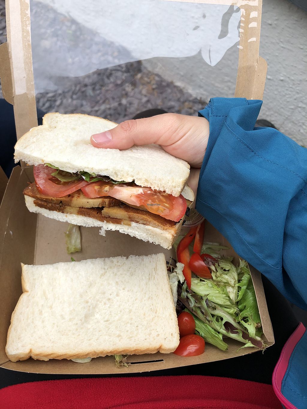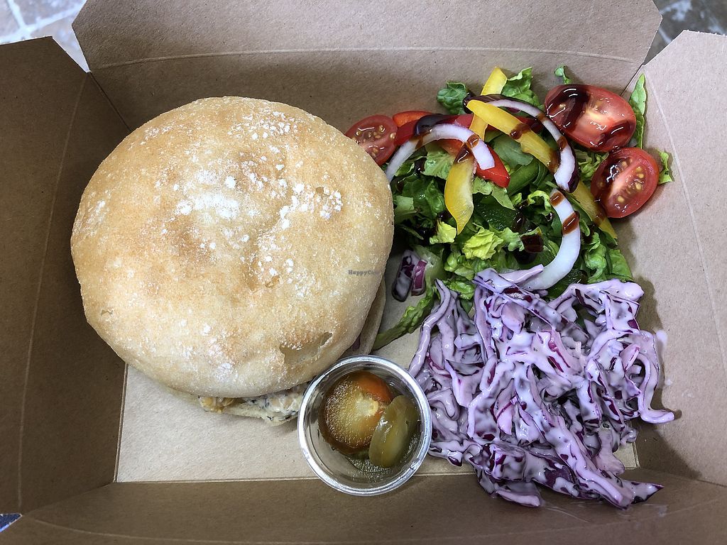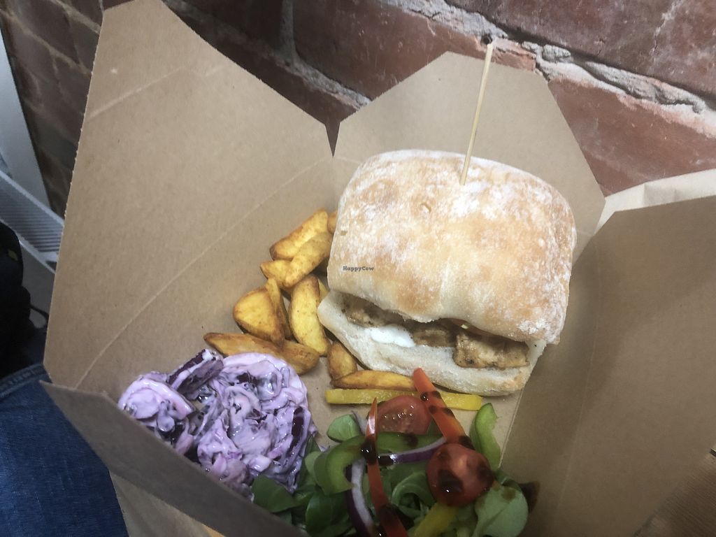 Had an off menu ‘club sandwich’ with the tofu chkn seitan bacon with a side coleslaw and salad. Really well made coffee too!