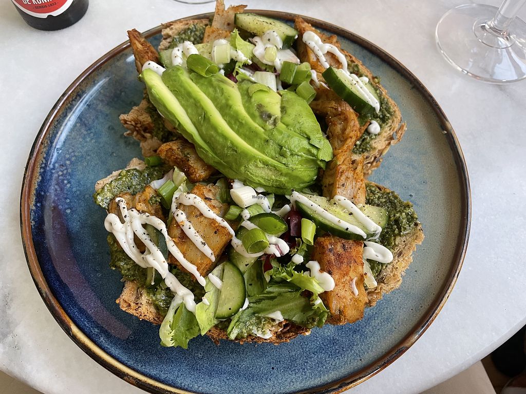 Vegan zalm met avocado, vegan kruidenkaas en scrambled tofu