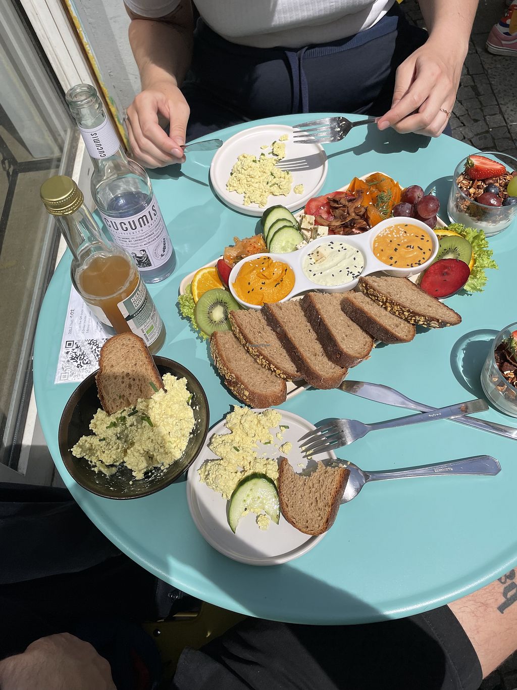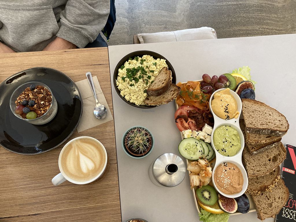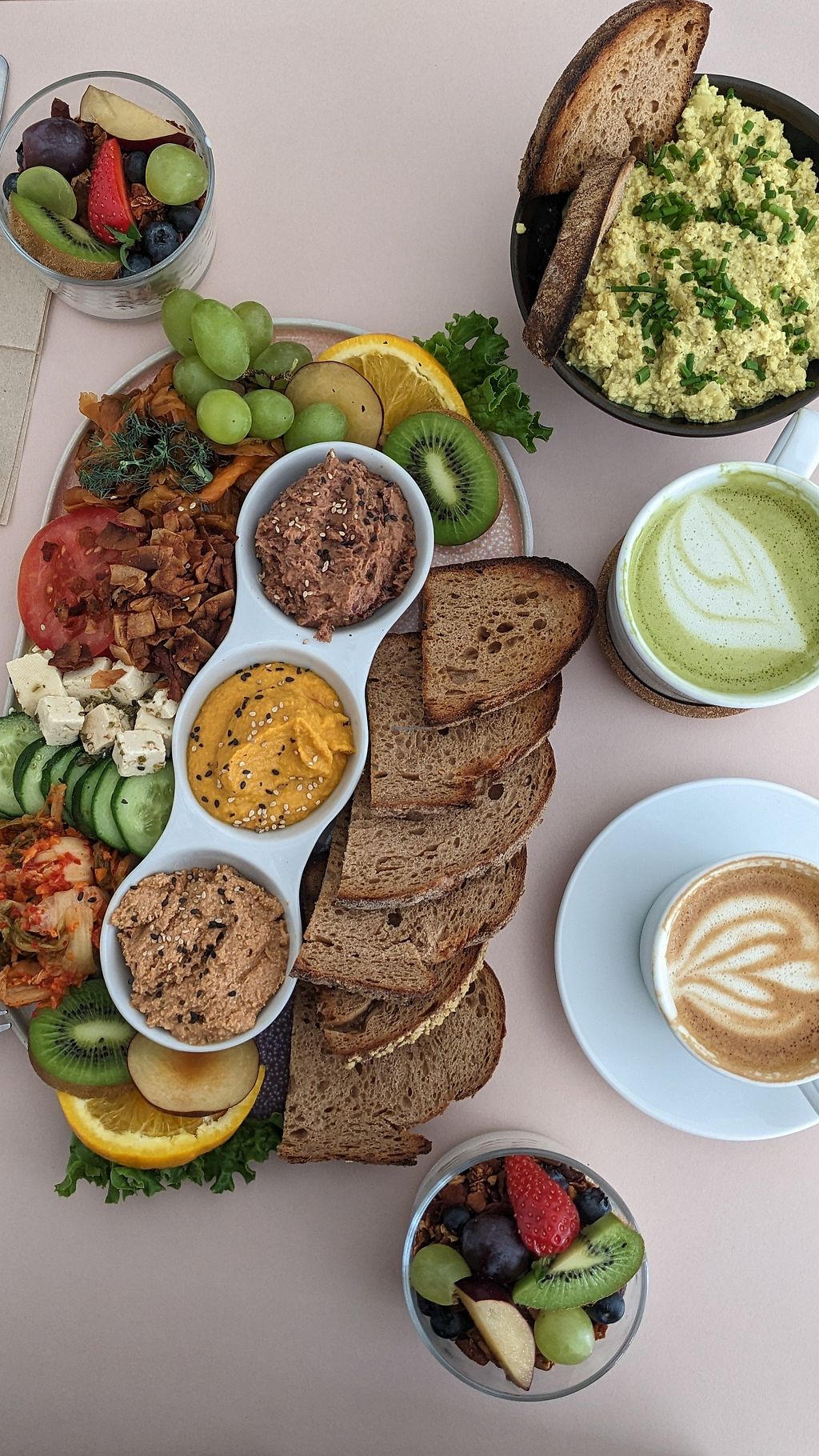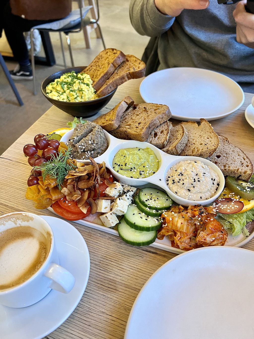 Cozy atmosphere and we had an excellent healthy breakfast for two persons to share. It included bread, different hummuses, vegan ”feta” made from tofu, yogurt and granola and vegan scrambled ”eggs”.