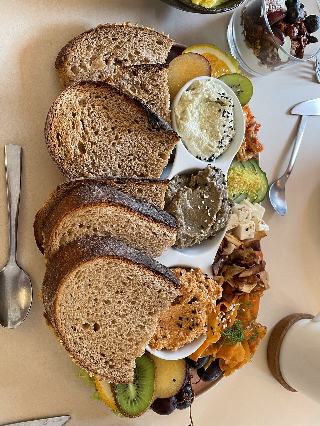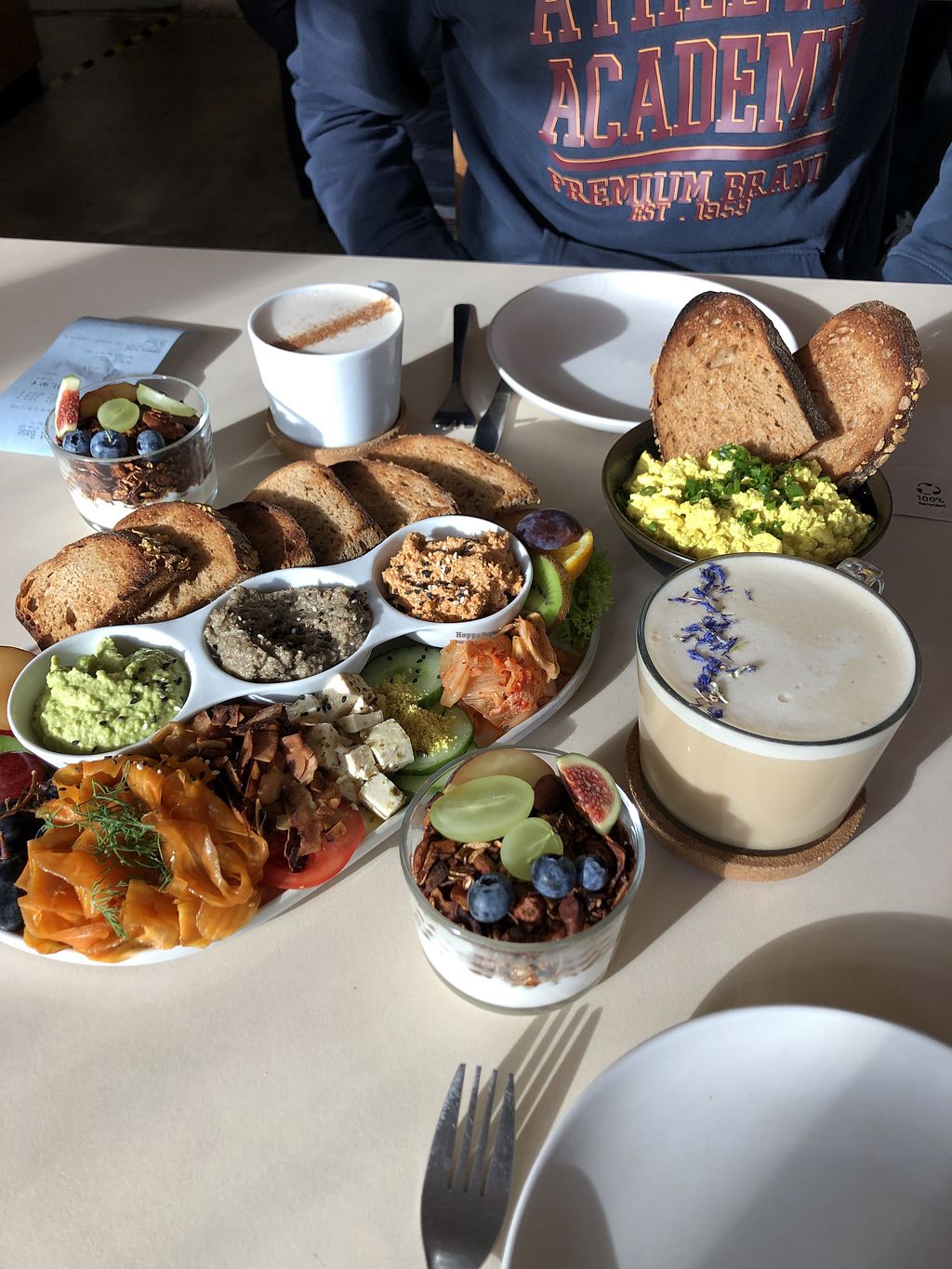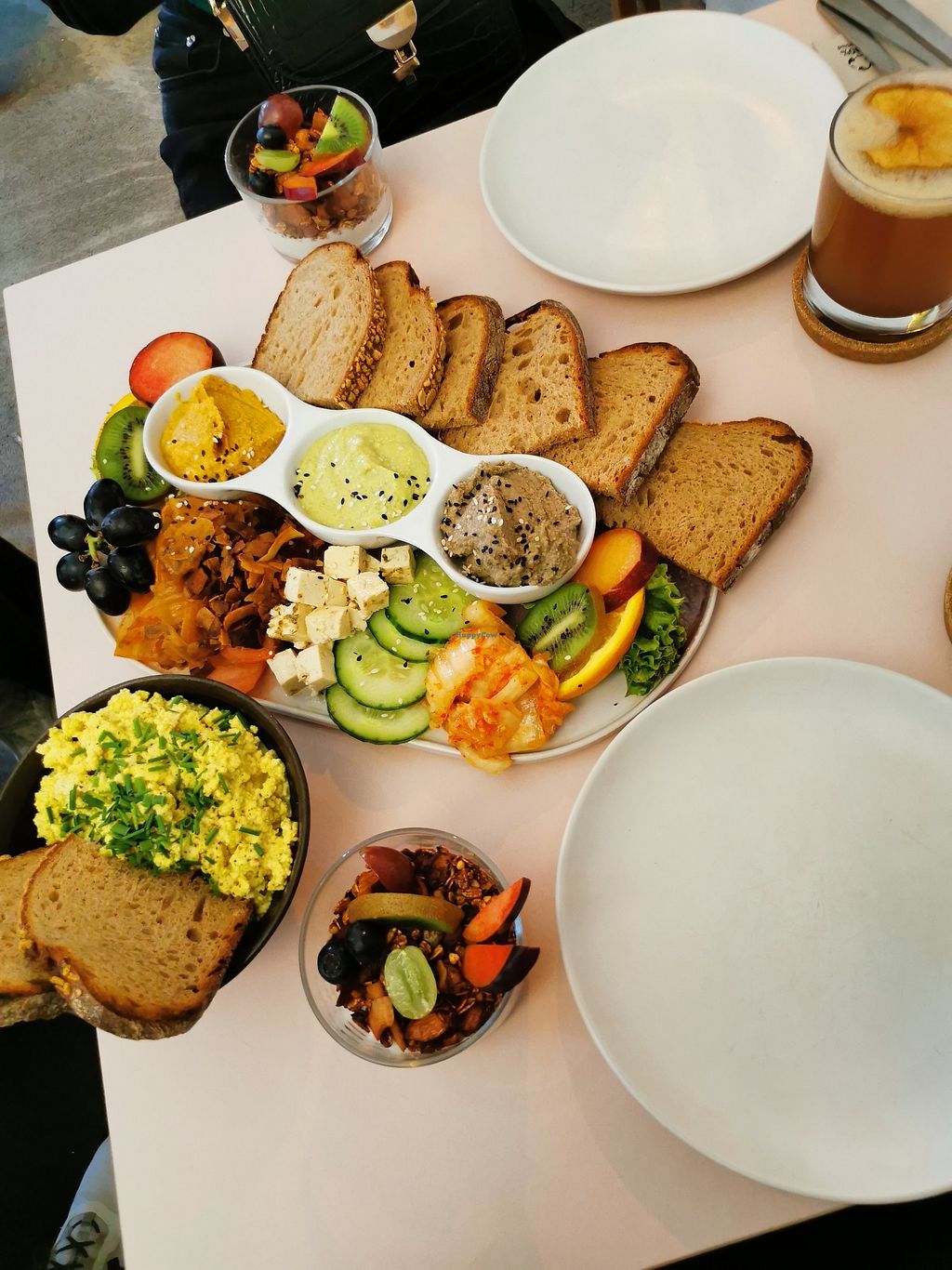 Cozy atmosphere and we had an excellent healthy breakfast for two persons to share. It included bread, different hummuses, vegan ”feta” made from tofu, yogurt and granola and vegan scrambled ”eggs”.