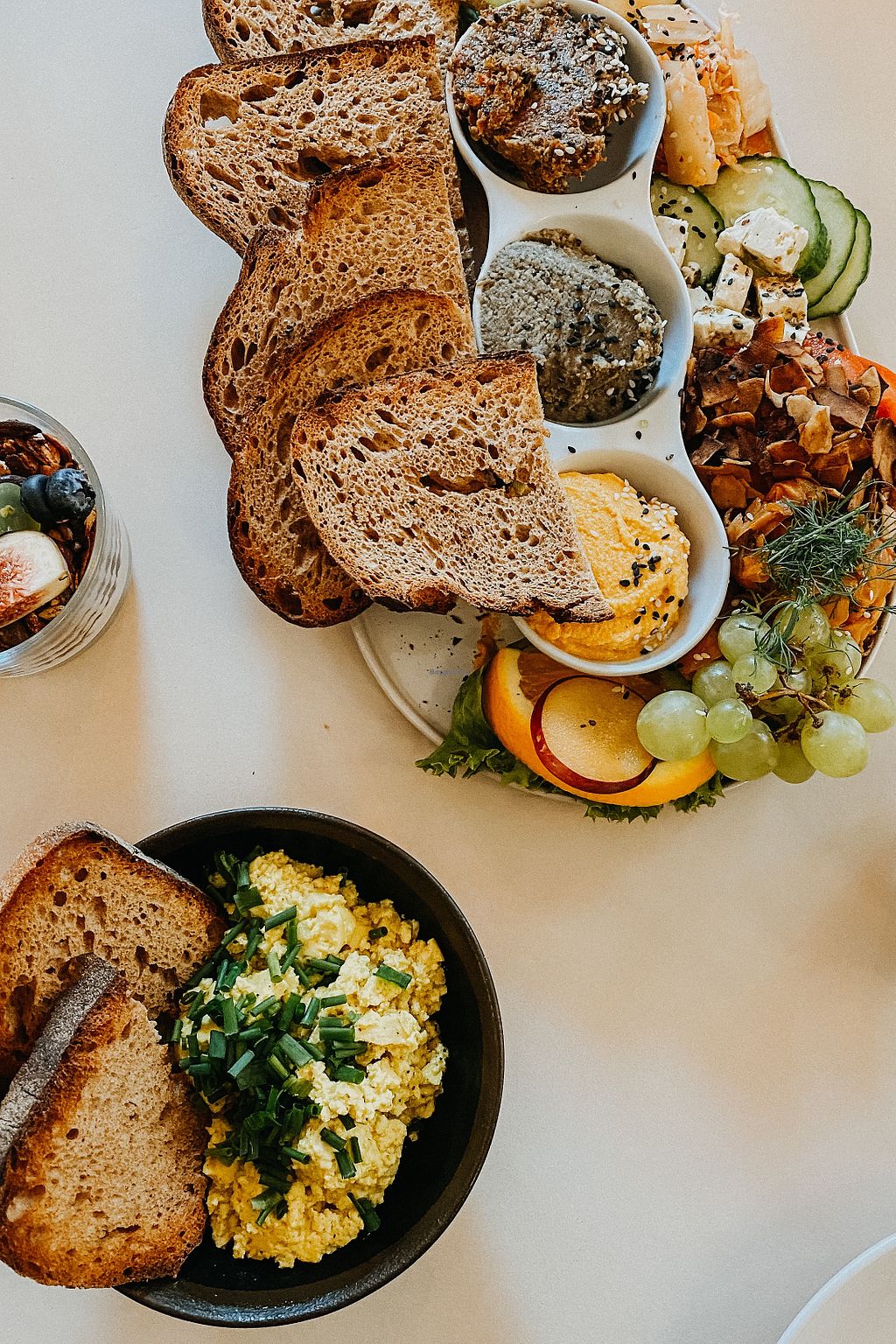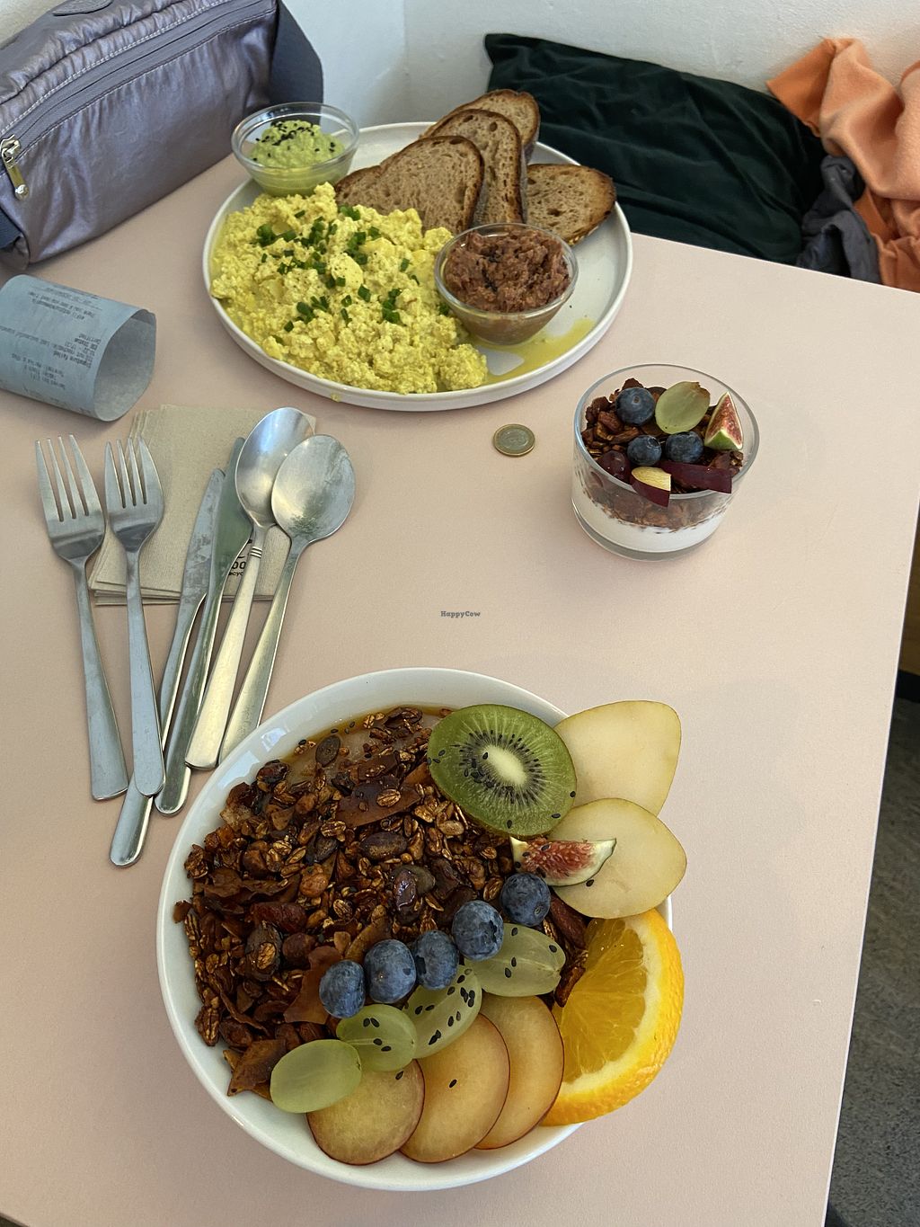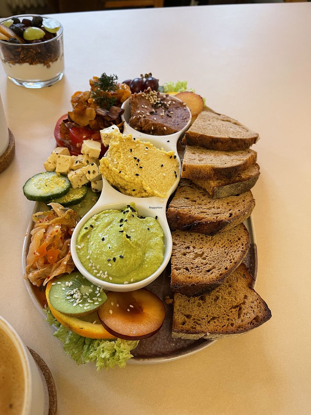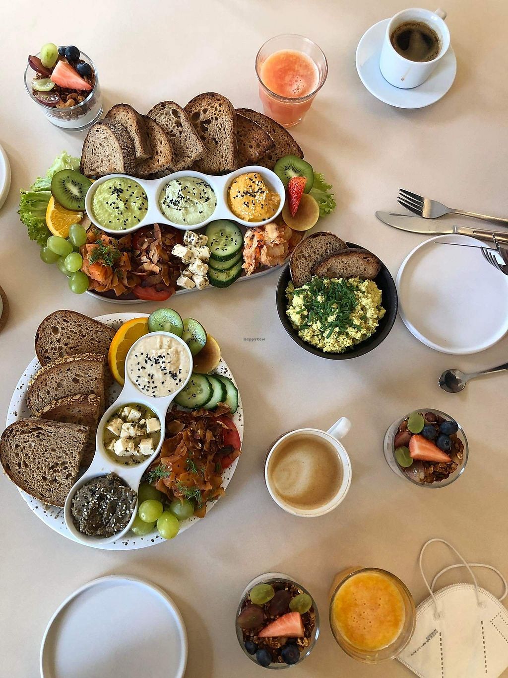 Cozy atmosphere and we had an excellent healthy breakfast for two persons to share. It included bread, different hummuses, vegan ”feta” made from tofu, yogurt and granola and vegan scrambled ”eggs”.