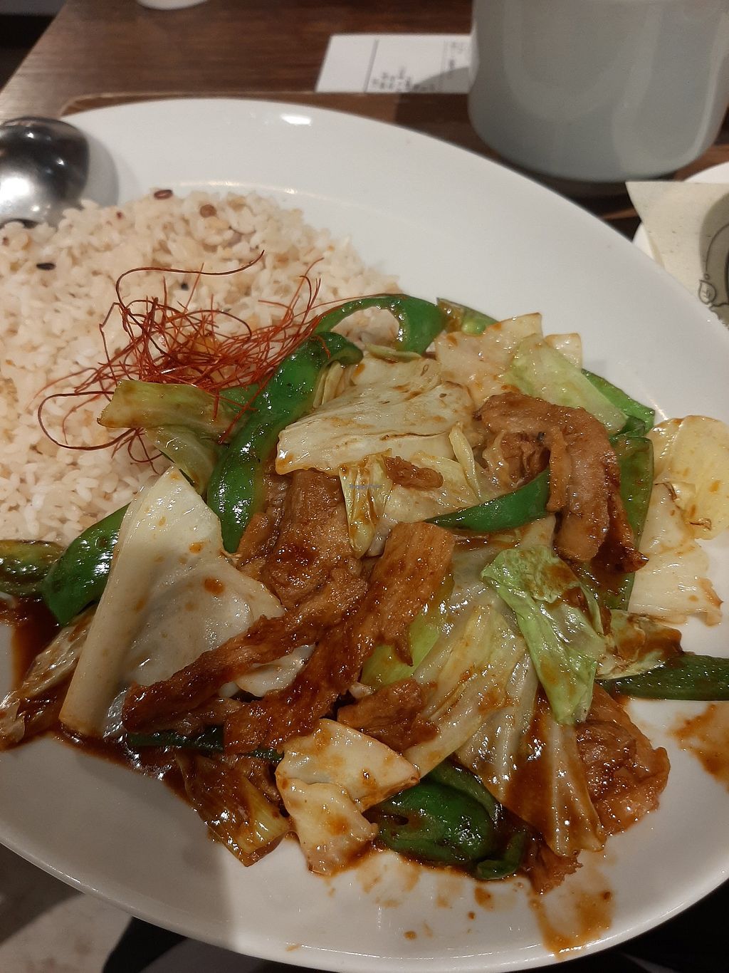 - Second main dish: Authentic double-cooked pork-style soymeat stir fried with cabbage, green peppers, and green onions