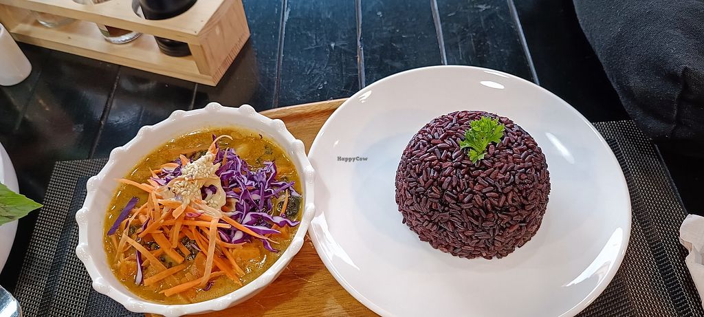 Chilli basil & soy meat stir-fry, with red riceberry