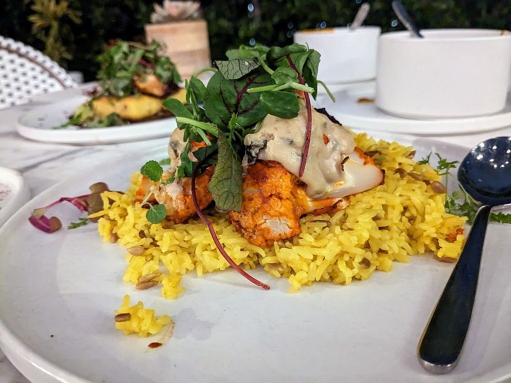 HARISSA CAULIFLOWER Saffron Rice, Fried Caper Tahini