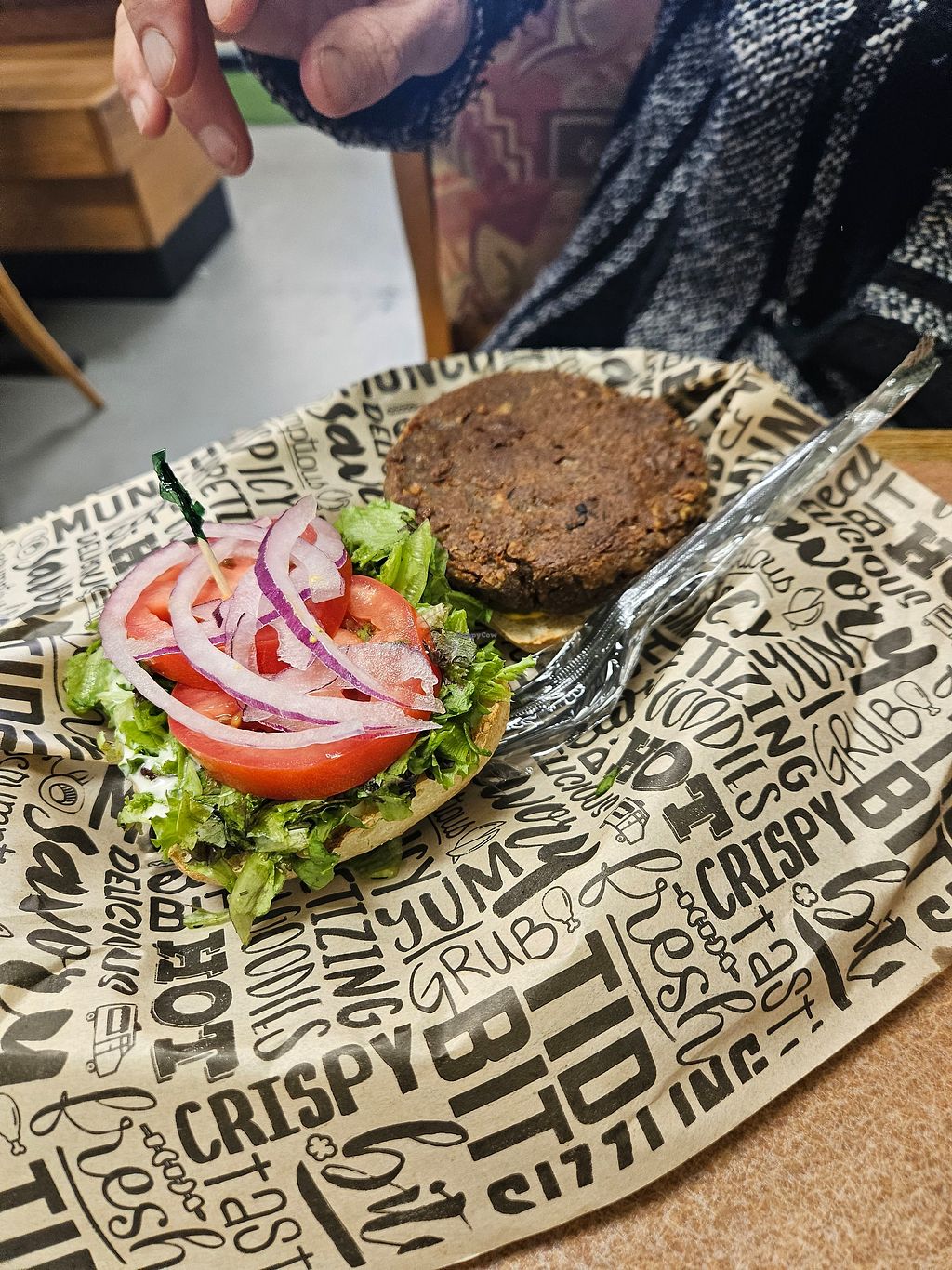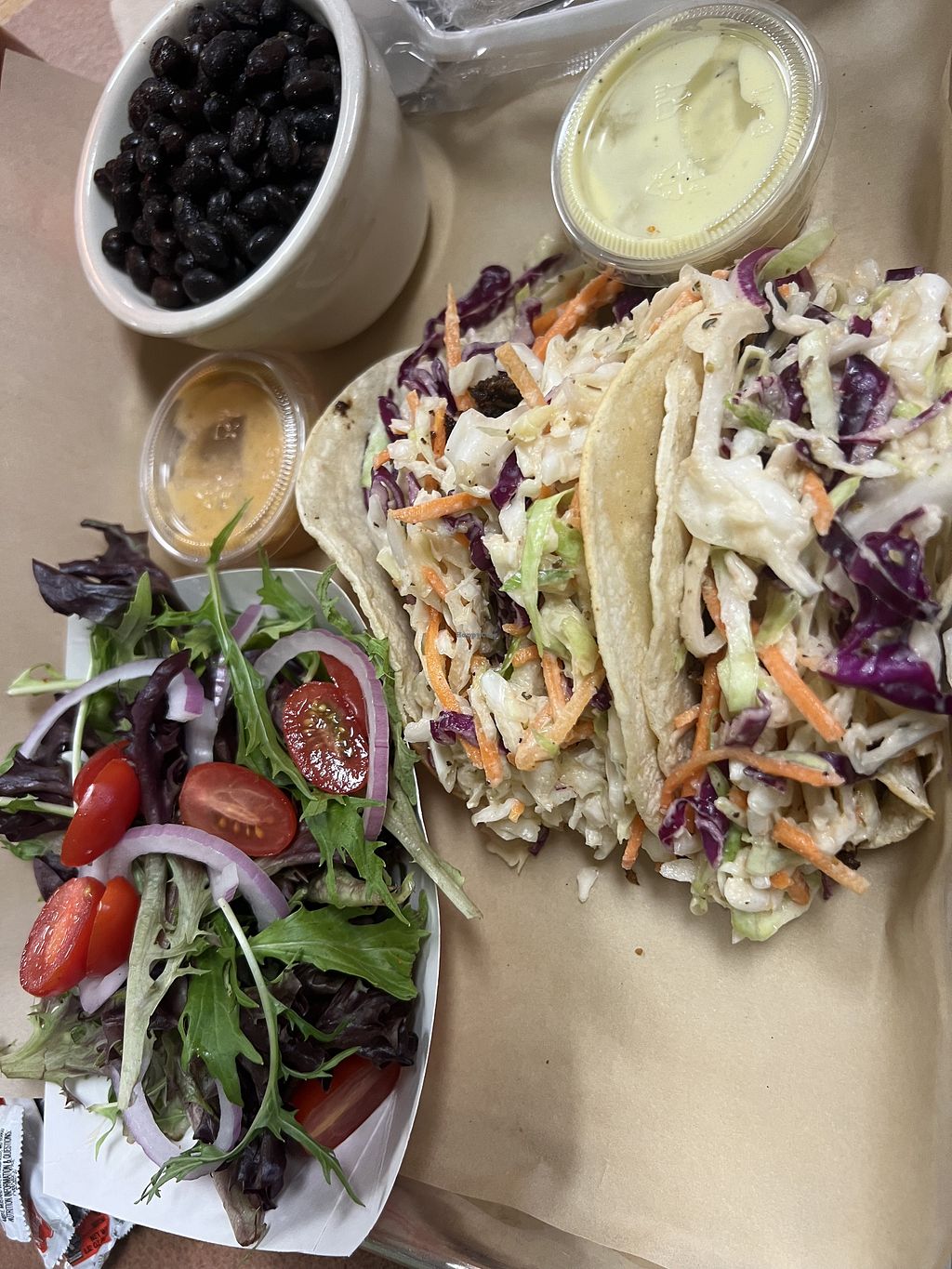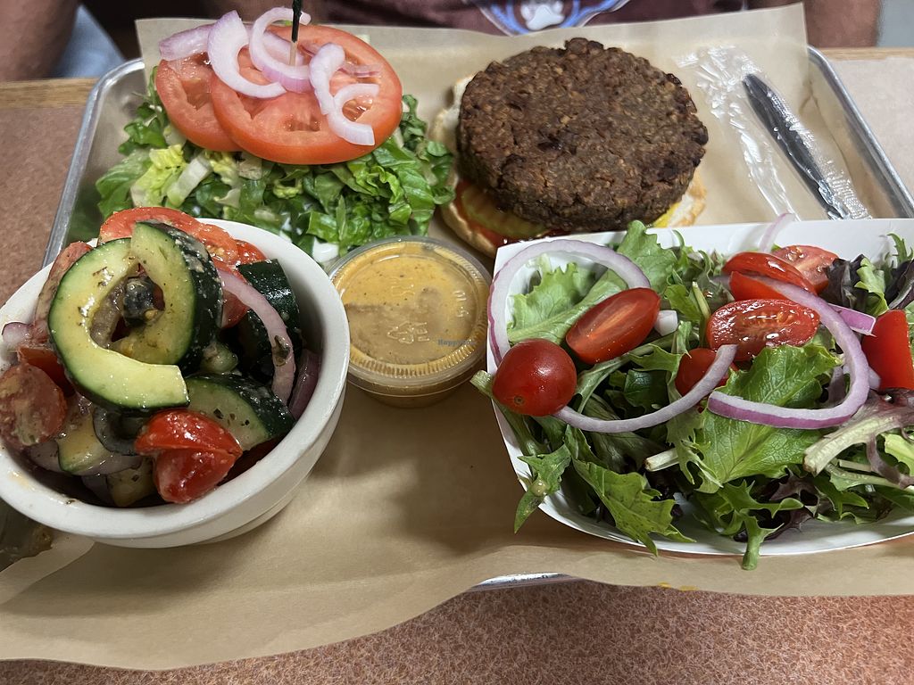 We had spicy black bean burger, a spicy tofu wrap, Cole slaw. All delicious and fresh. Loved it. Can’t wait to go back.