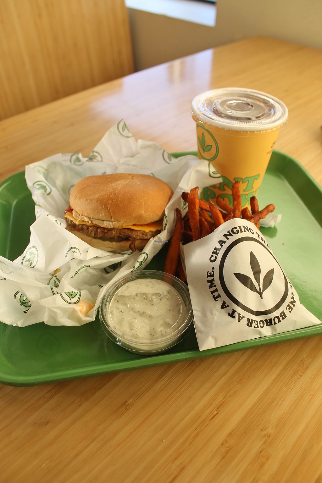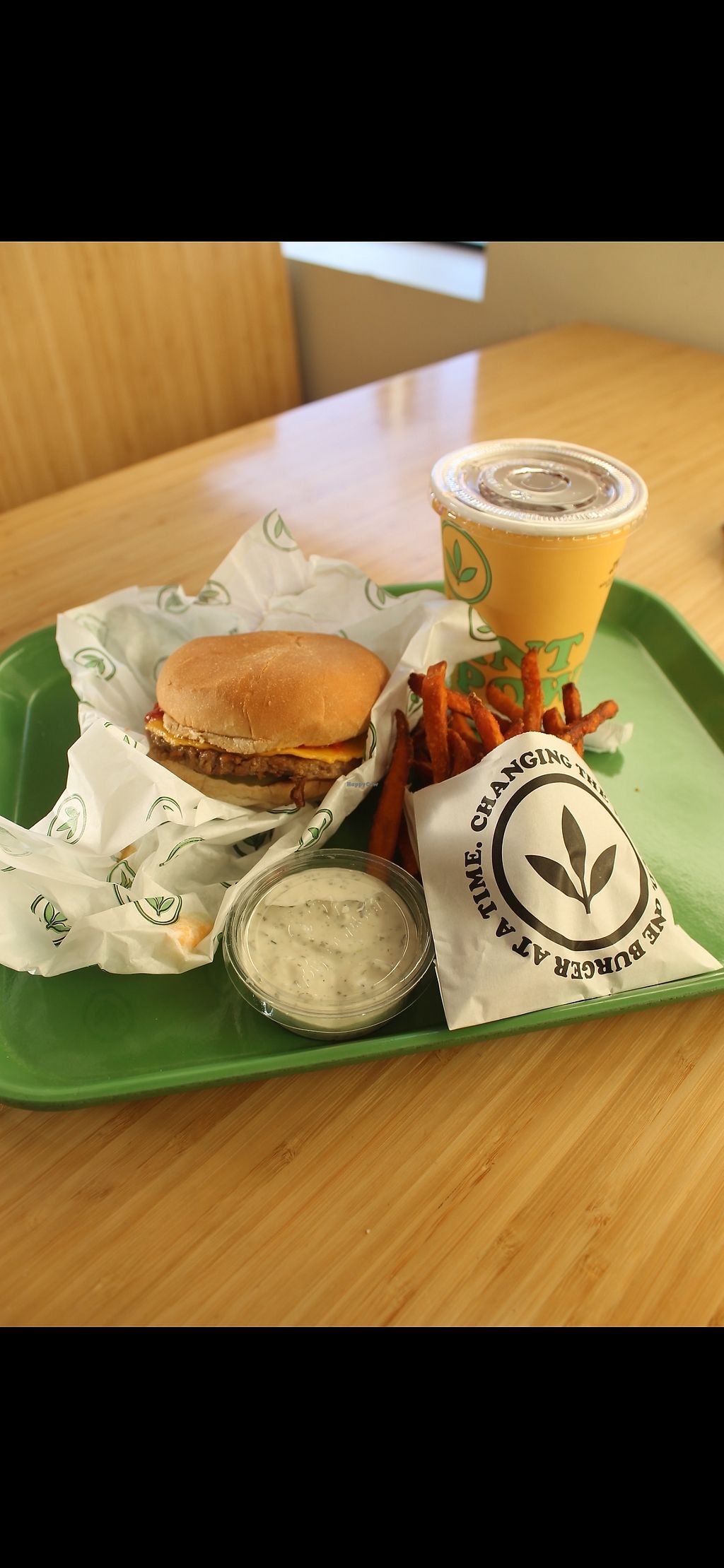 My husband got a peanut butter shake and it was delicious! I usually just stick with the basic hamburger and sweet potato fries. The service here was super friendly and the combination of trippy music, wavering greenery, and delicious flavors made me feel a little buzzed, pleasantly so and without use of toxic chemicals. Such ethical deliciousness and fun.