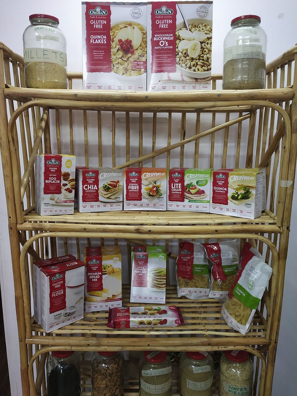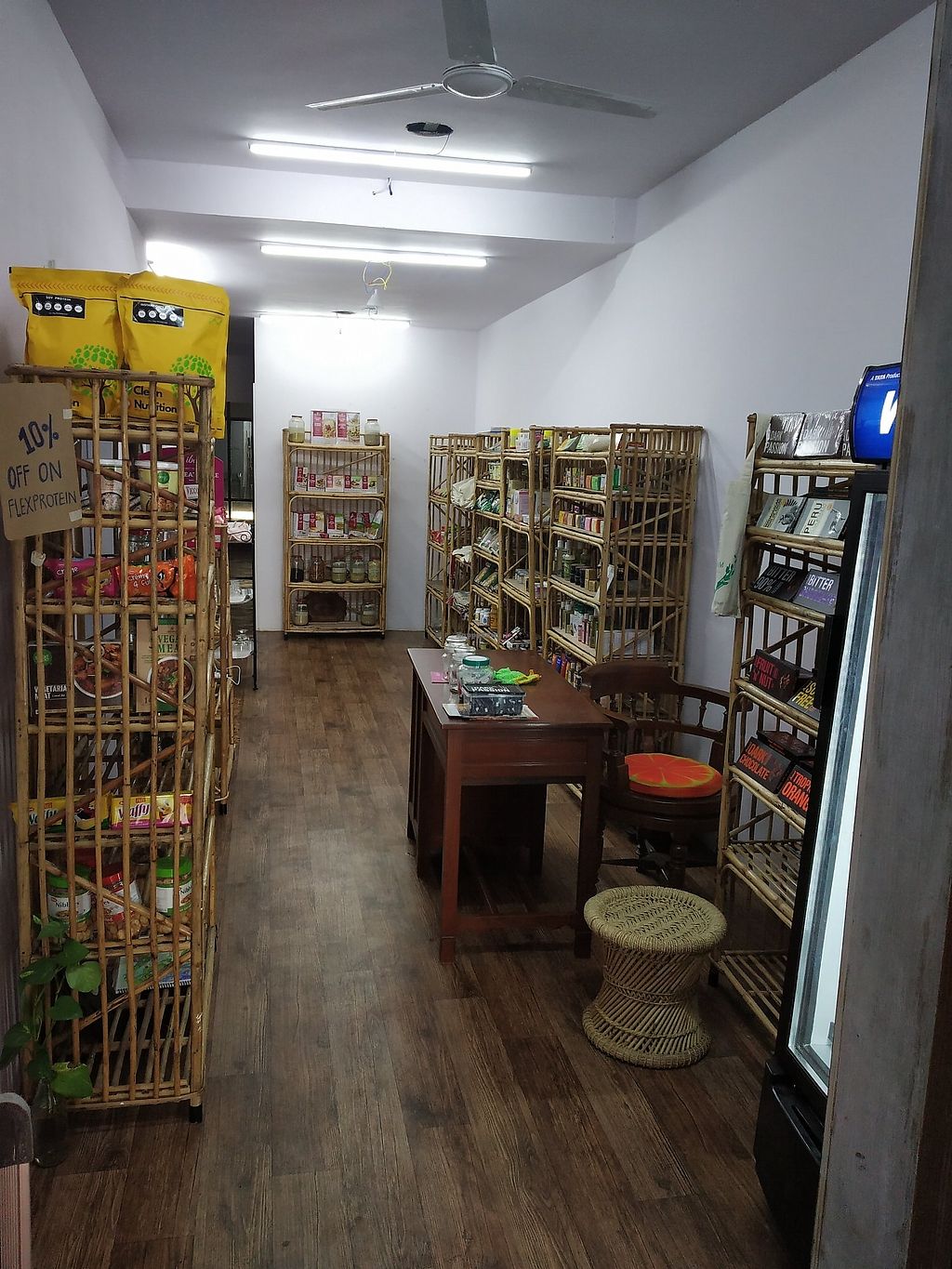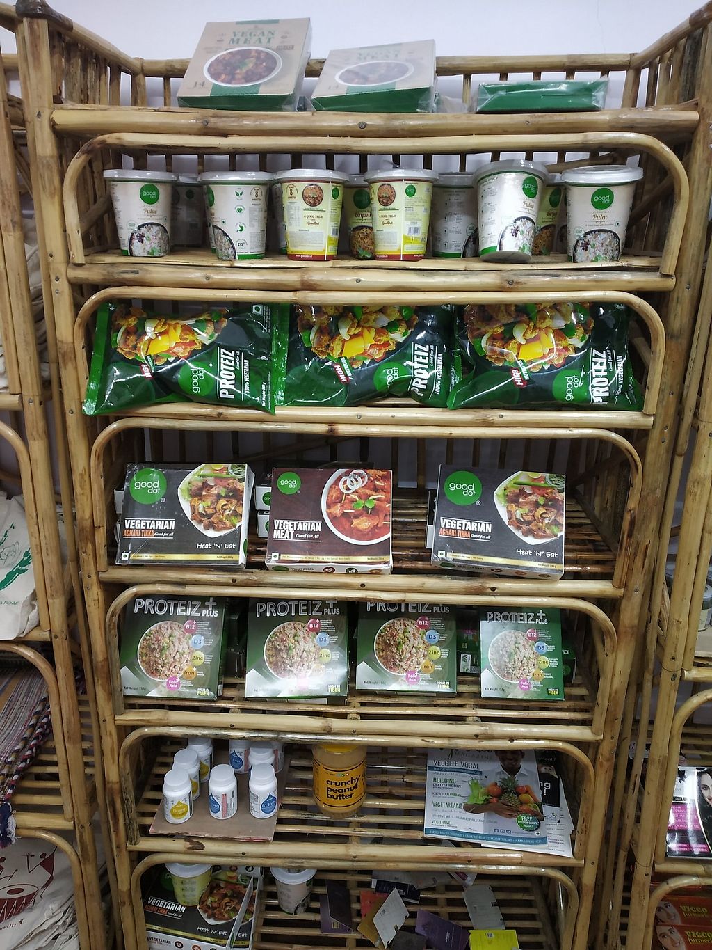 The store has a lot of vegan products available, such as chocolates, breakfast mixes, energy bars, butter, ghee, ice cream, cookies, bread.