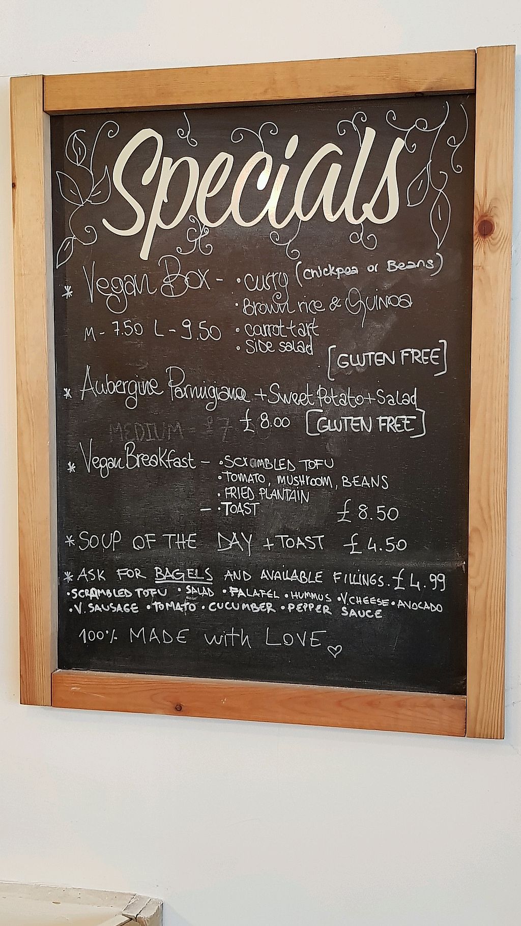 Met a lovely waitress and had a great conversation. She was very bubbly and generous. She made me a delicious vegan sausage, salad and avocado bagel and was kind enough to give me a side of the delicious scrambled tofu and the sweet potato wedges. Highly recommend as all food is vegan and there are a selection of snack drinks and some warm food: usually a curry with sides, an all day breakfast, a pie and salad or a bagel.