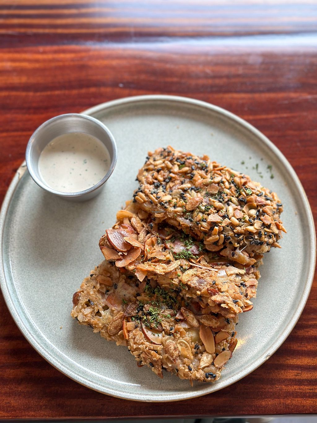 I ordered the Monte Cristo along with a Pink Matcha (unfortunately, it didn't turn out as pink as I had hoped but the lady apologized for that!). The sandwich contains cacao bread, plantichicken, plantironi, plantibrii, jam, and sugarcane honey. It was really delicious! The sandwich is divided into 4 pieces, and honestly, I couldn't eat it all. I spent $15 for the brunch, which seems a bit expensive, but considering the portion size, I have no complaints.