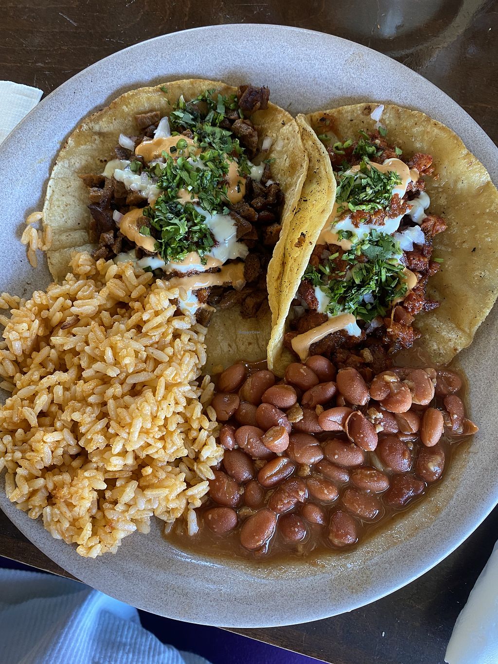 Asada taco and al pastor taco (2 taco plate served with rice and beans…