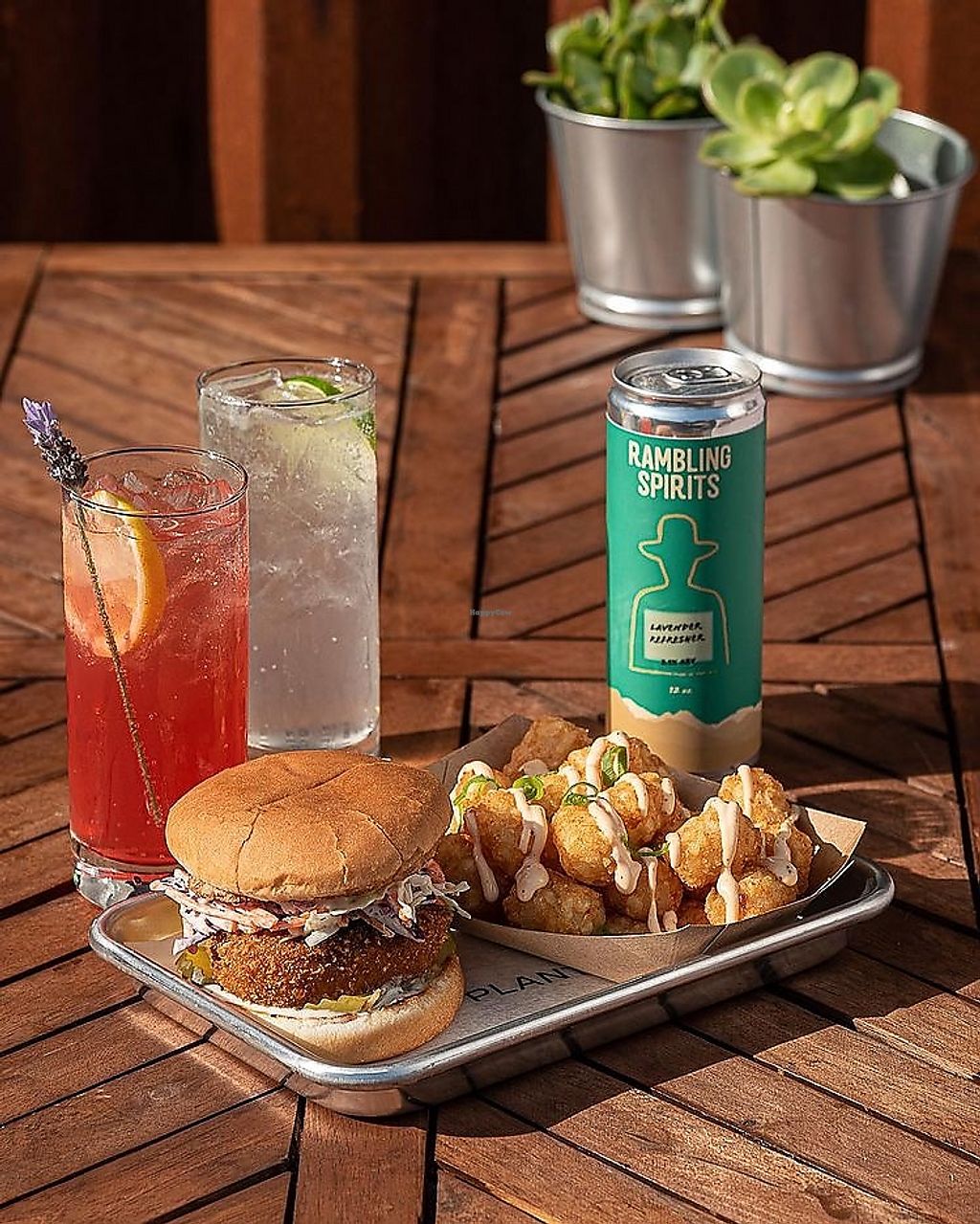 Fried vegan chicken sandwich with pub tots