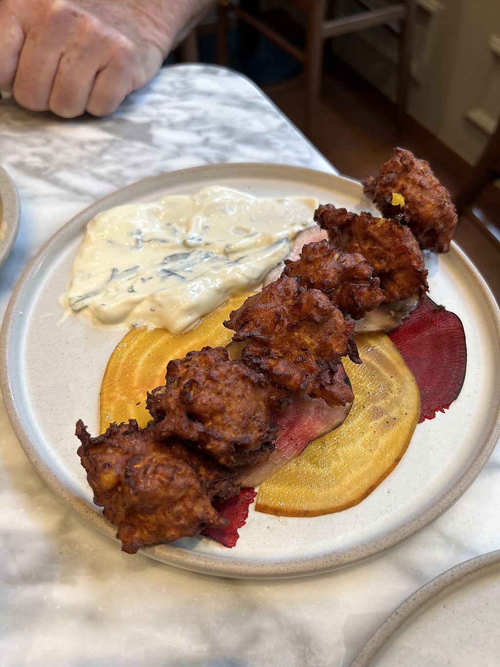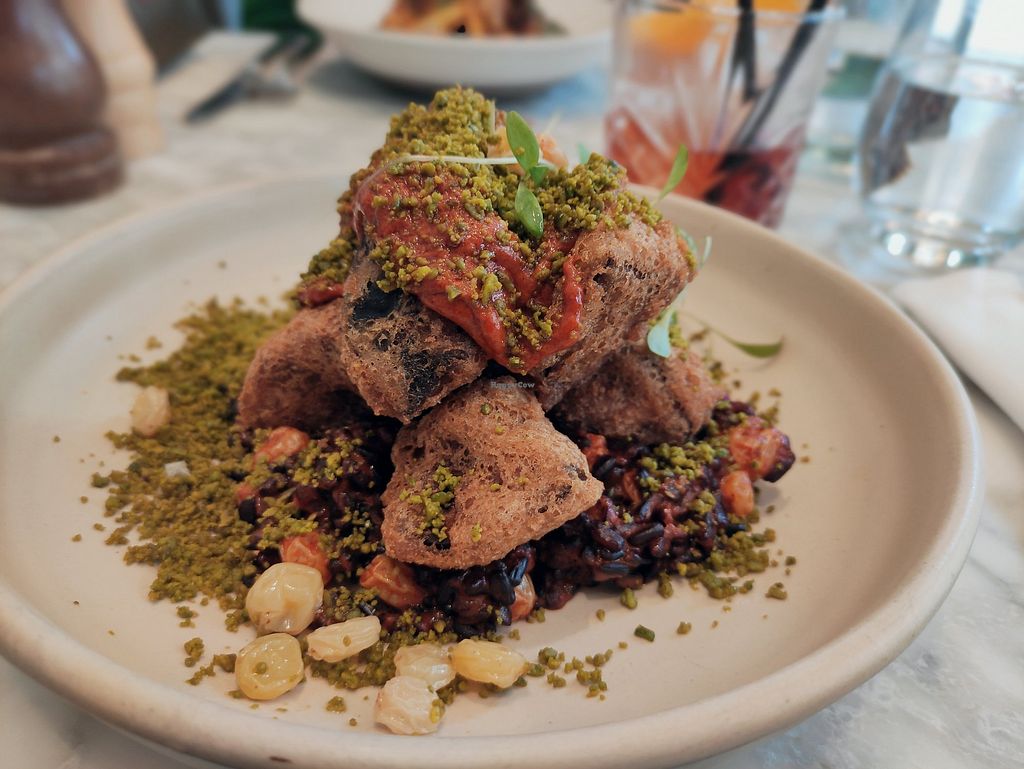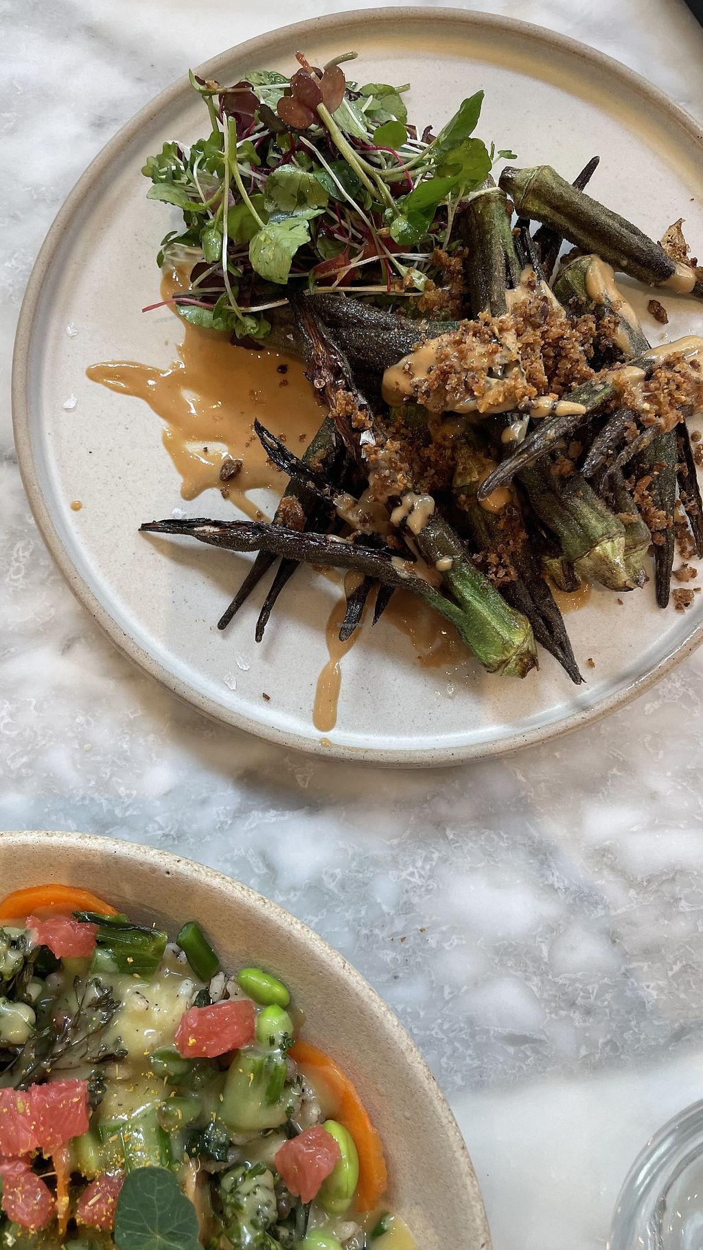 Had the okra fries that come with a delicious sauce, sweet corn fritters with pickled beetroot, the butter beans with kale, and hot flatbread with cashew butter. All exceptional! Love that there’s no processed food, all fresh, colourful, and satisfying. Definitely recommend!