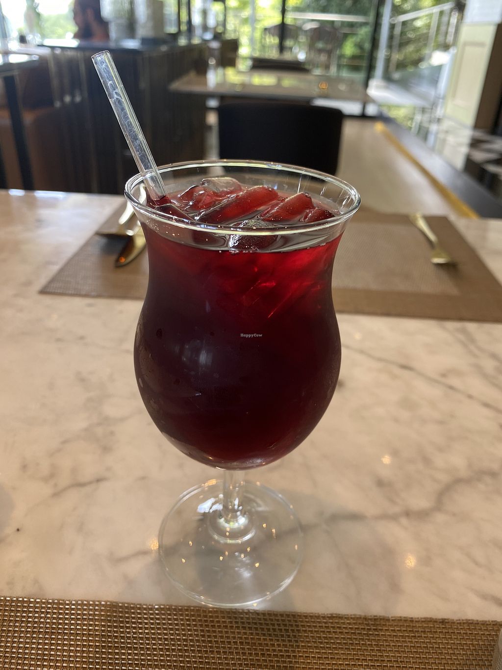Veggie burger with lettuce, tomato, sauce, hibiscus/roselle tea