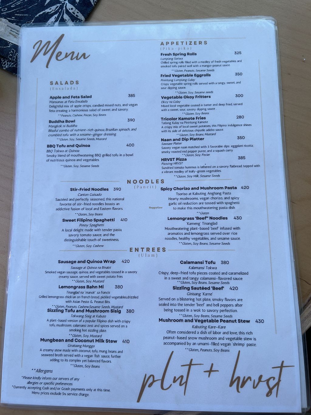 Est. Aug 2023 (as of this date, it is the only plant-based/vegan restaurant in Lio Beach). Serves an array of Filipino dishes made with fresh ingredients such as mushroom & tofu sisig and mushroom kare-kare, in addition to a variety of noodles, salads, and more. Also offers locally-roasted specialty-grade coffee to be paired with a maja-blanca brulee or chocolate mousse. NOTE: Inside Lio Beach Estate in between the main parking lot and the beach. Open Mon-Sun 9:30am-9:00pm.