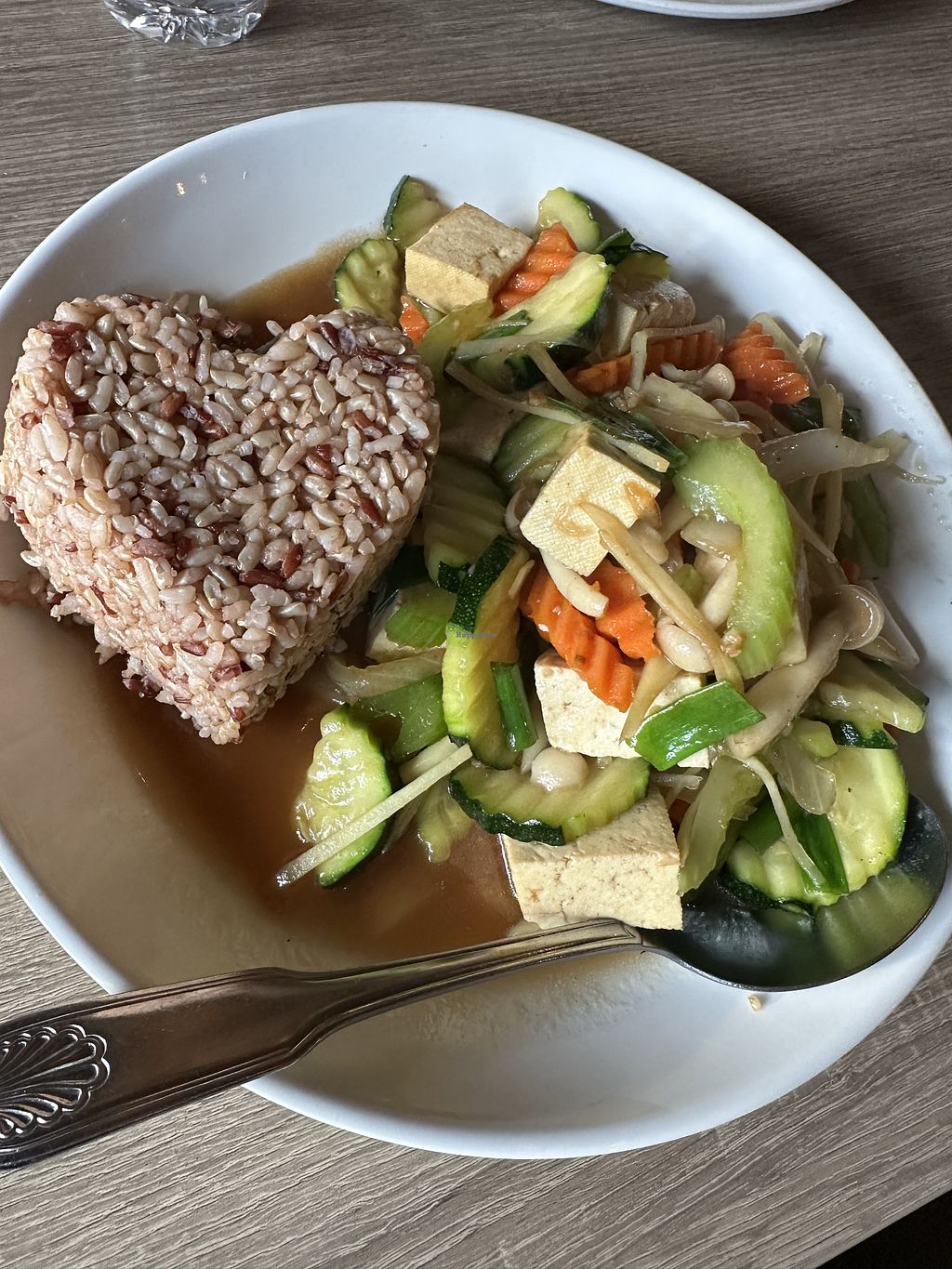 Read moreFriendly staff work here. Casual and simple dining indoors or outdoor seating. I went with the pumpkin curry with steamed tofu and brown rice that came shaped like a heart. Ample portions. It came medium heat by default and had a good amount of heat yet not overbearing. I added a touch of the made in house chili oil yet proceed with caution as a little goes a long way since this packs some serious heat.