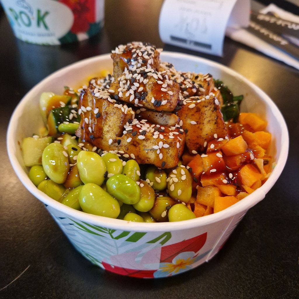 Located in a small shopping center, POK is a nice alternative to falafel and other vegan options with its asian/hawaiian style. I had a yummy Aloha bowl (with Quinoa and Tofu) that was enough of a portion. Tofu is prepared better than at most places (not almost fluid and free of taste)