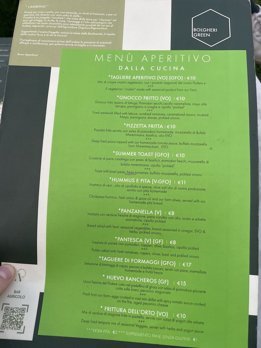 We had a very nice aperitivo in Bolgheri Green (that's how it's definwd as on Google Maps). The same space has a Bistrot (open for lunch only) and a restaurant (open for dinner only). The main difference is price (in the evening it almost doubles). For the aperitivo there are mainly vegetarian dishes, but they state that it is possible to ask for a vegan version. We had 2 glasses of wine (local and organic) and the tagliere and paid 18€. It's not cheap for Italy, but the location is very nice.