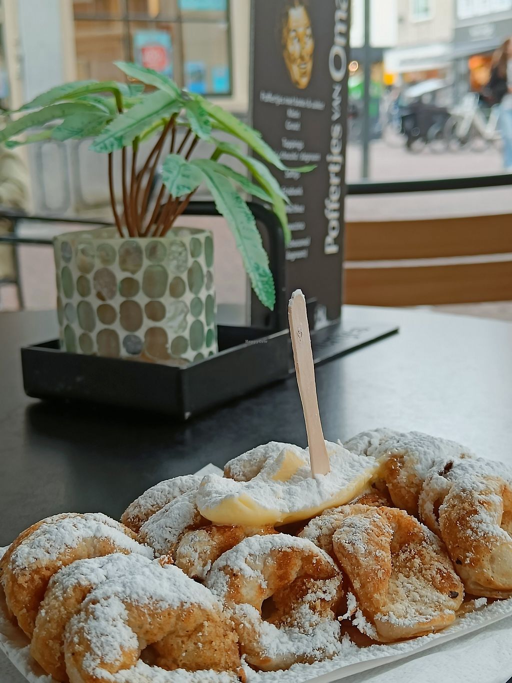 First time having classic, Dutch vegan poffertjes that I didn't make myself! Staff didn't hesitate when I asked about vegan poffertjes and immediately offered vegan butter. When they brought the order steaming hot to the (outdoor) table, she confirmed it was vegan butter without being asked. Poffertjes were hot and tasty but several had a slightly burnt aftertaste, perhaps the grill was too hot. That said, I still very much enjoyed them.