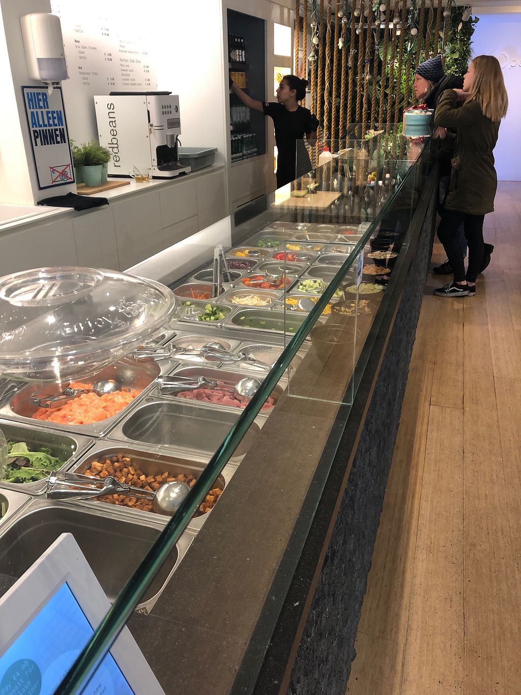 Serves meat, vegan options available. Dutch poké chain with vegan choices. Menu includes three vegan poke bowls which include vegan salmon, sticky tempeh and miso tofu as well as customizable bowls. Also offers side dishes such as seaweed salad, vegan spring rolls and pickled vegetables. Open Mon-Sun 11:30-21:00.