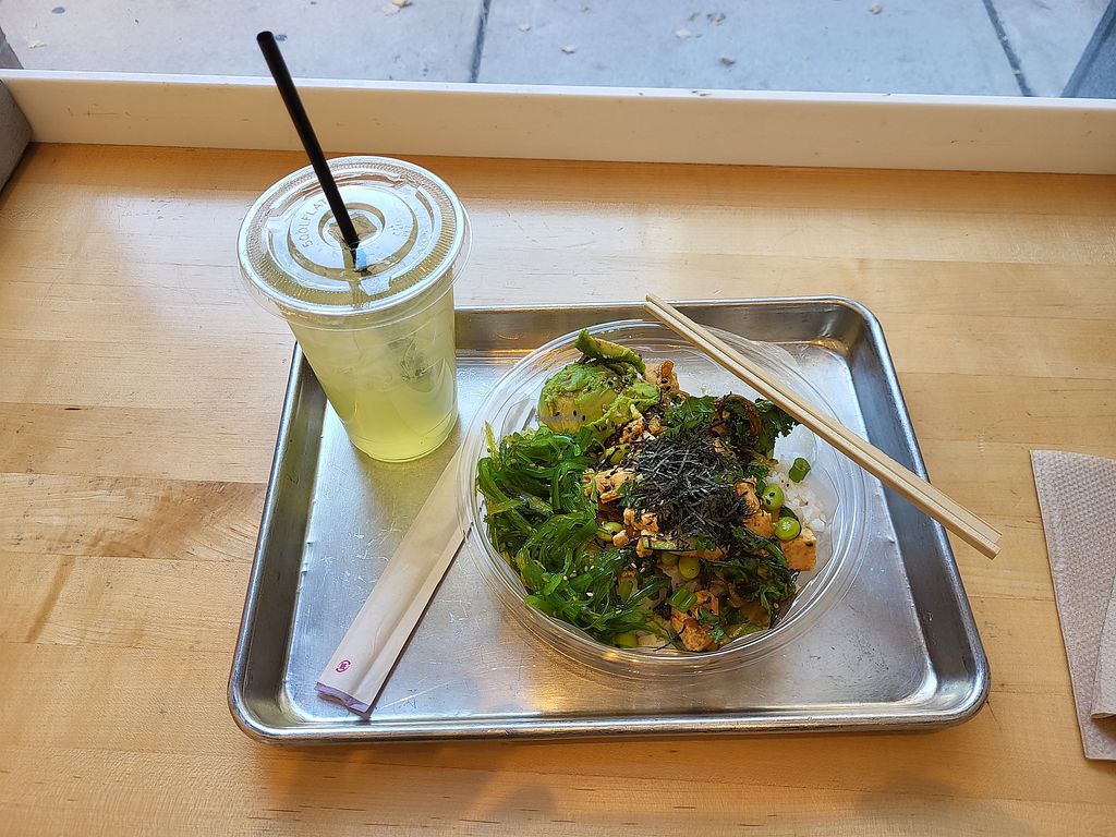 Serves meat, vegan options available. Fast-casual poke bowl chain restaurant offering a vegan ahi tuna bowl, build-your-own bowl or burrito with ingredients like tofu and veggies. Note the tobiko topping is not vegan. Allergens are labeled on menu. Open Mon-Fri 11:00am-9:00pm, Sat-Sun 12:00pm-9:00pm.