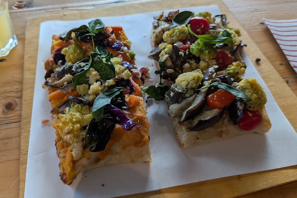 Unique pizza choices, had slices of both the carrot hummus based pizza and Baba ganoush pizza. Very clear about what is vegetarian and vegan. Good atmosphere.