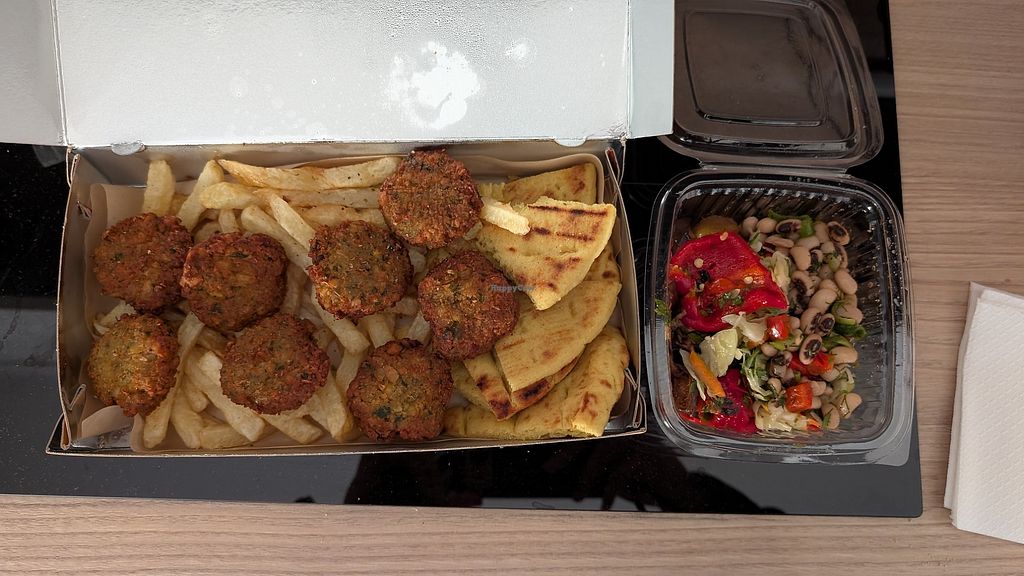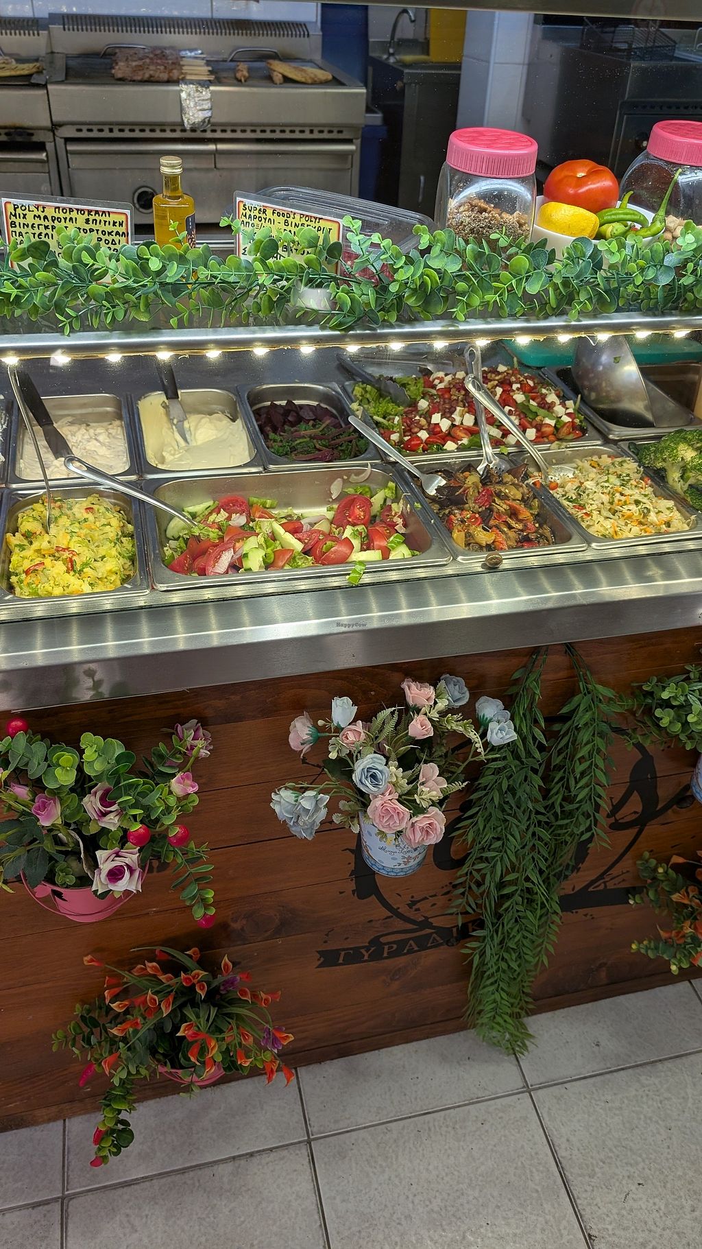 Serves meat, vegan options available. Small gyros place with vegan choices such as falafel, fries, black-eyed peas salad, and roasted vegetable salad. The venue has a 'vegan' label outside and staff is familiar with vegan requirements, though they speak limited English. Open Mon 12:00pm-12:00pm, Tue-Sat 12:00pm-12:00am. Closed Sat & Sun.