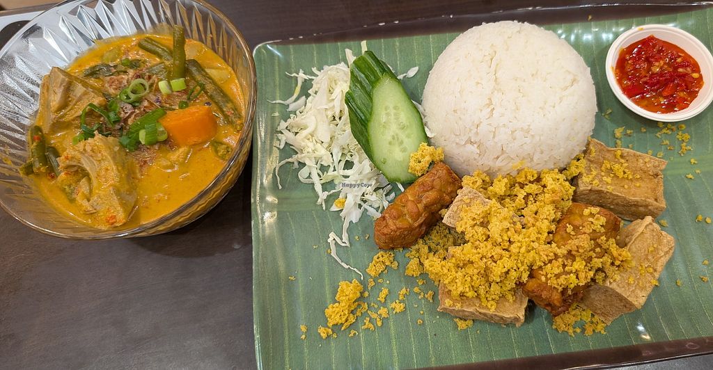 Serves meat, vegan options available. Restaurant offering veganizable dishes like sayur asam (sweet and sour vegetable soup), gado gado (Indonesian salad with peanut sauce and rice crackers), and tahu tempe on rice (tofu and tempeh with rice and curry soup). Open Mon-Sun 9:00am-8:30pm.
