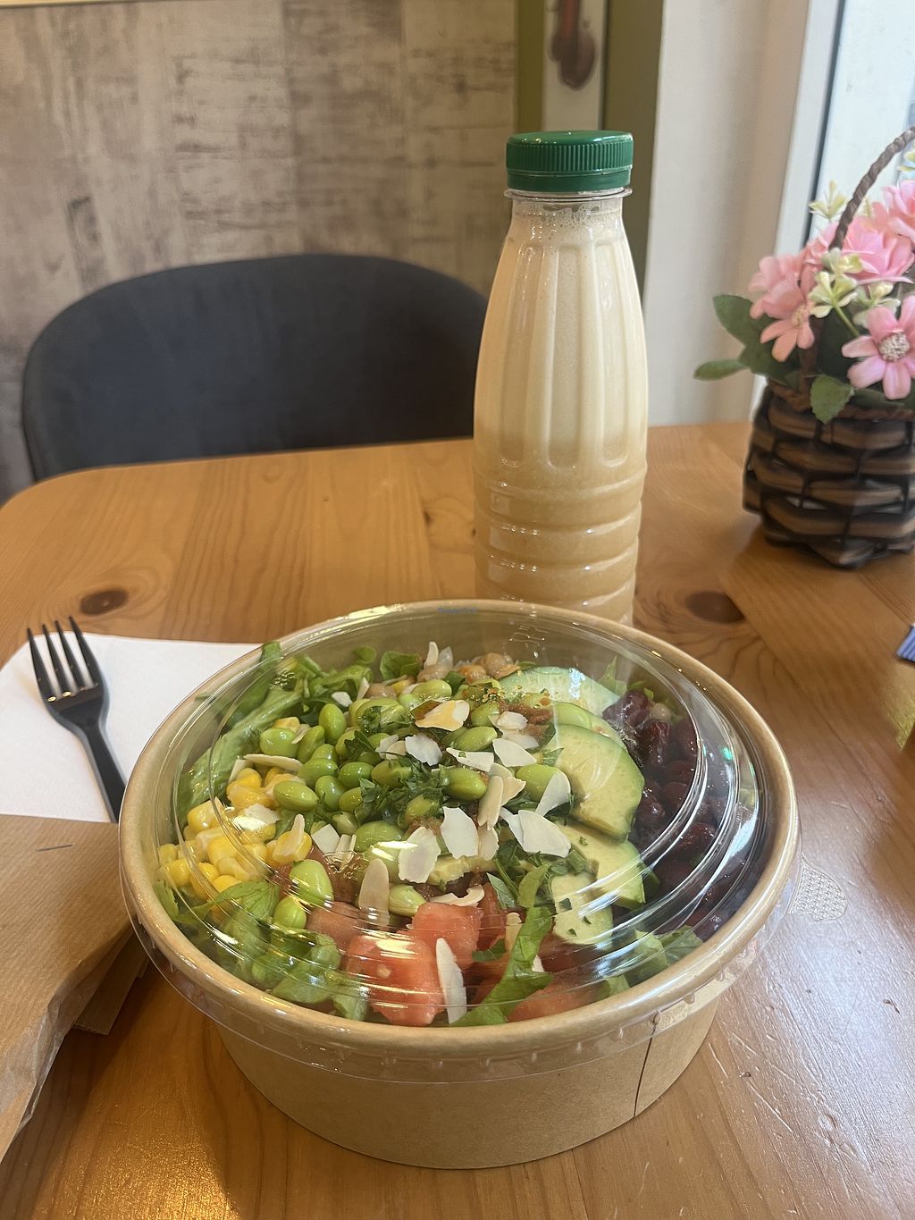 I had the vegan tortilla which has a chickpeas paste and a bunch of vegetables. Flavorful, while still quite healthy. It comes in two different sizes and with white or whole wheat tortilla. I also had a carrot-apple juice which was really good too. They have lots of other vegan options. Nice place to sit in- and outside. It wasn’t crowded at 10am on a weekday. I highly recommend and would definitely be back to try more.