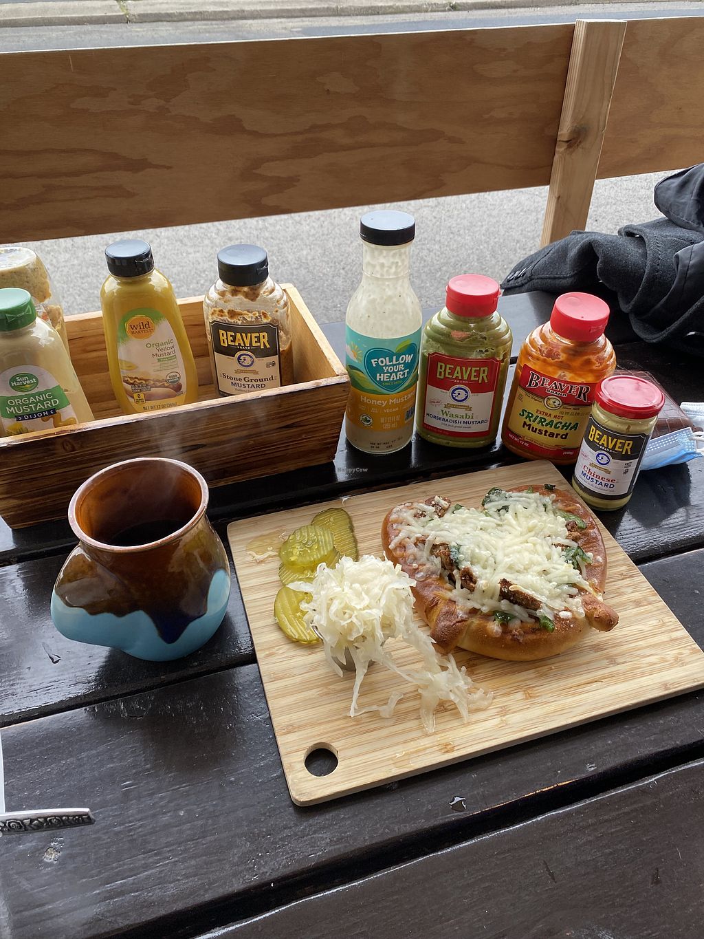 Simple pretzel with 10 different mustard choices-- Hot, crusty, yeasty.