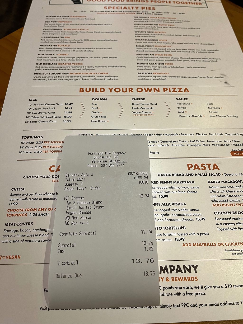 Portland Pie Company makes me think back to my pre-vegan days 28 years ago eating Pizza Hut, because this pizza comes close. I ordered the "Build Your Own" personal pie with garlic crust, vegan cheese, marinara, spinach, and kalamata olives (because I love a good Greek pie). After about 40 minutes of sipping my water while listening to screaming children and rowdy college kids on break, the pizza finally arrived. I was a bit skeptical seeing just a few leaves of charred spinach and red sauce peeking out from under a thin layer of cheese, but the real issue was the olives which just tasted like brine. I ate one piece and sent the rest back. My server asked if I wanted another pie with different toppings and I should've said no, but I opted for just the plain vegan cheese and sauce when she said they'd put a rush on it and it would be just 5 minutes. Ten minutes later, my Pizza Hut pie arrived at my table. It was just as awful with flaccid crust and metalic tasting marinara, but at least it wasn't loaded with salt. Then to top it off, they billed me an extra $2 claiming there was an upcharge for the vegan cheese. Since it doesn't say that anywhere on the menu I refused to pay it, and the server came back with the correct bill. Awful experience. I will never go back there.