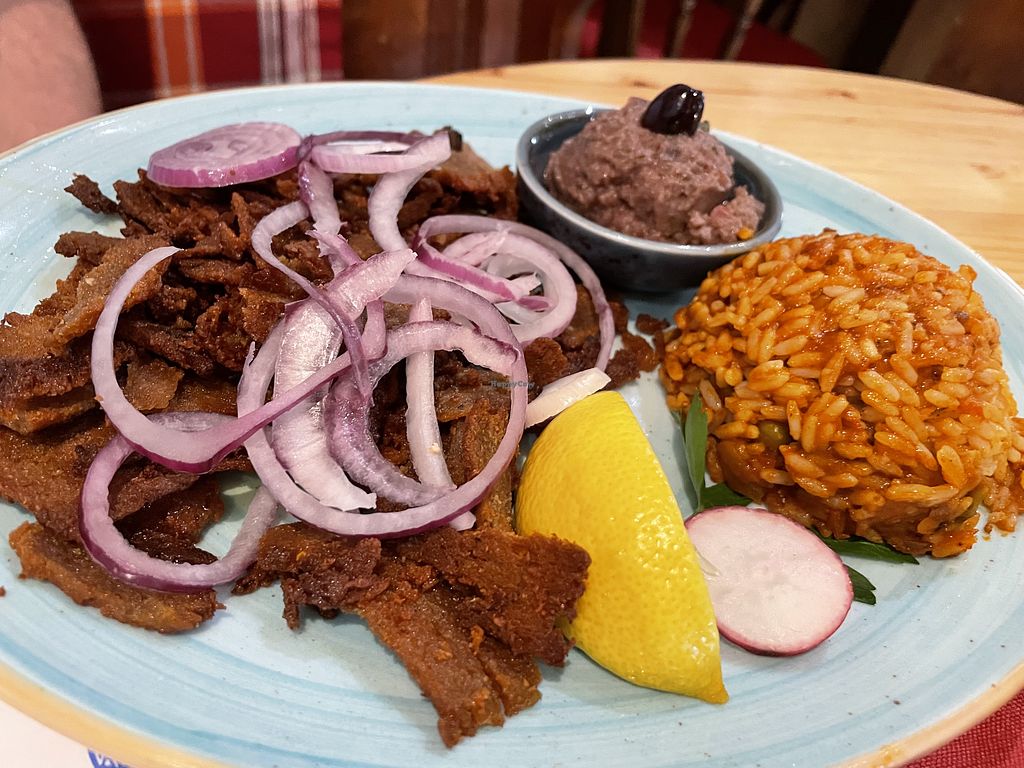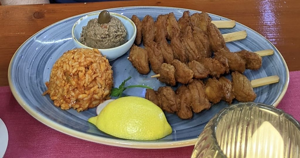 The garden is beautiful, there is a sun room whose roof can be opened in the summer and a traditional seating area inside. The vegan food is ok (vegan suvlaki, kebab etc. are not home made). The waiters are very nice and funny, but they did not seem to know a lot about veganism, so they brought a dessert on the house which largely consisted of yogurt.
