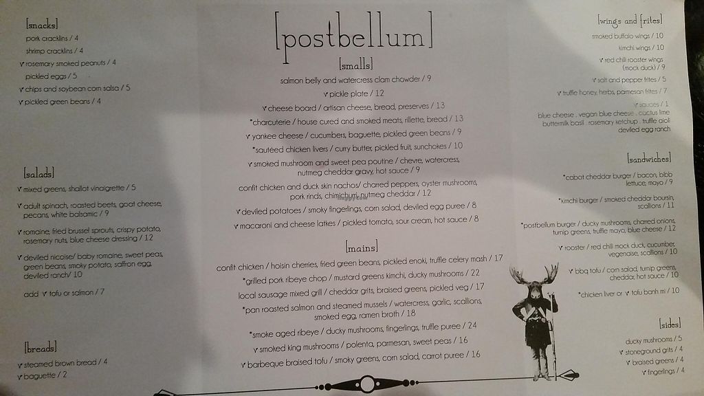 Serves meat, vegan options available. Offers separate vegan, vegetarian, and gluten free menus; ask the host. Choices include peppered cashew cheese appetizer, tofu bahn mi, bbq tofu entree, kale salad with smoked king mushrooms and cashew cheese, romaine salad with vegan blue cheese, brussels and fingerling potatoes. Seasonal menu. Reported closed February 2023.