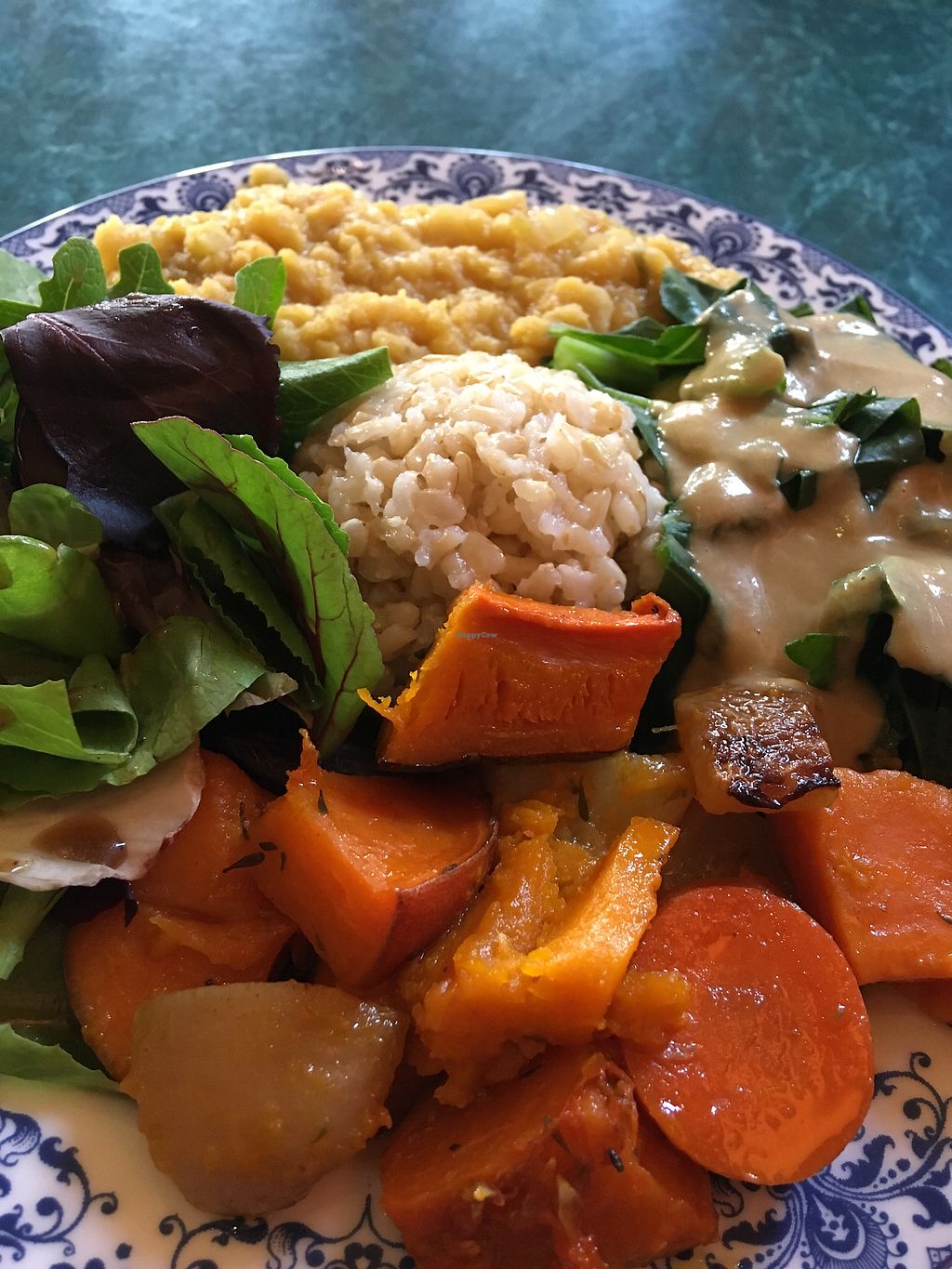 A full meal includes soup, rice, legumes, greens, mixed vegetables, an…