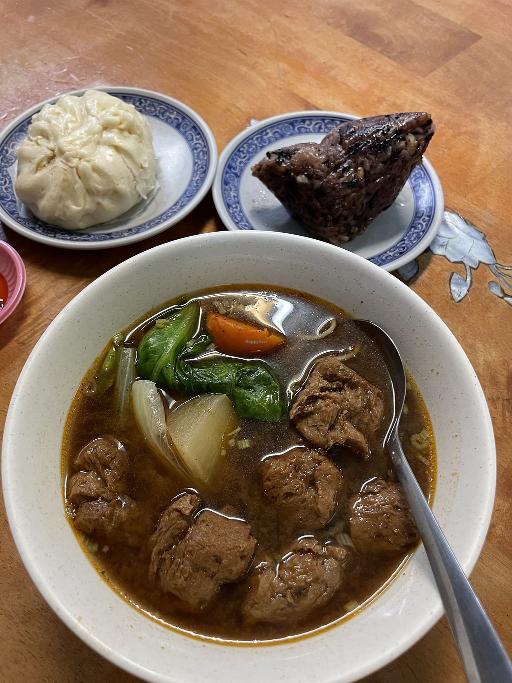 Pork bun, purple rice zhongzhi(savory sticky rice) and hearty noodle s…
