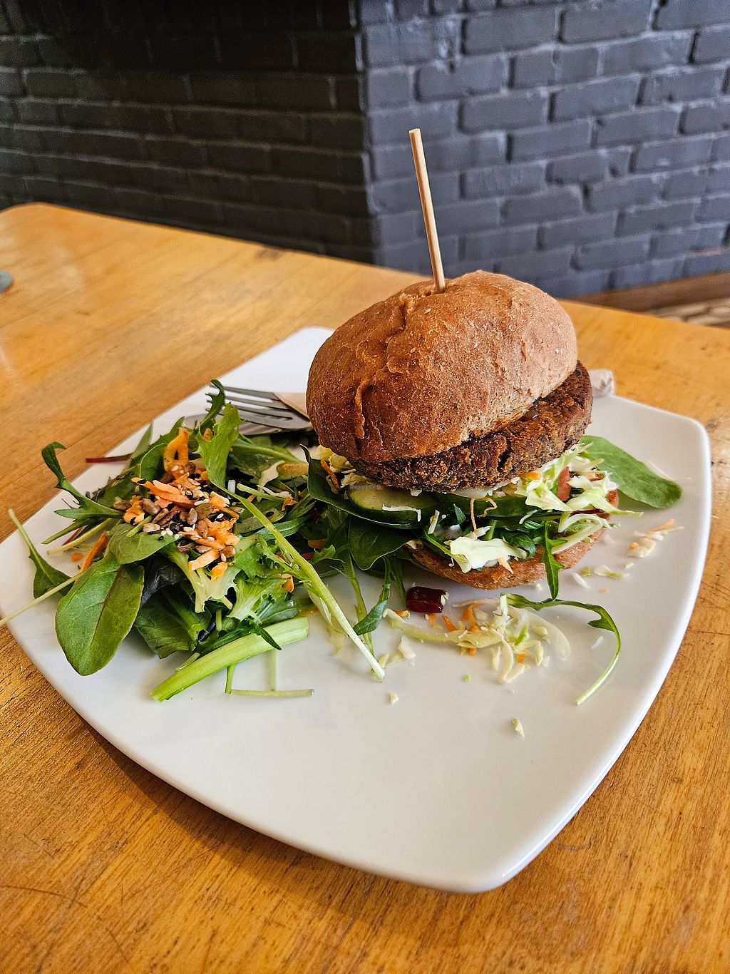 We hebben hier heerlijk gegeten en koffie gedronken. Twee keer een lunch. De vegan burger, huisgemaakt van zwarte bonen en kikkererwten kan zo in een kookboek! De filodeeg met paddestoelen vulling was ook een succes!