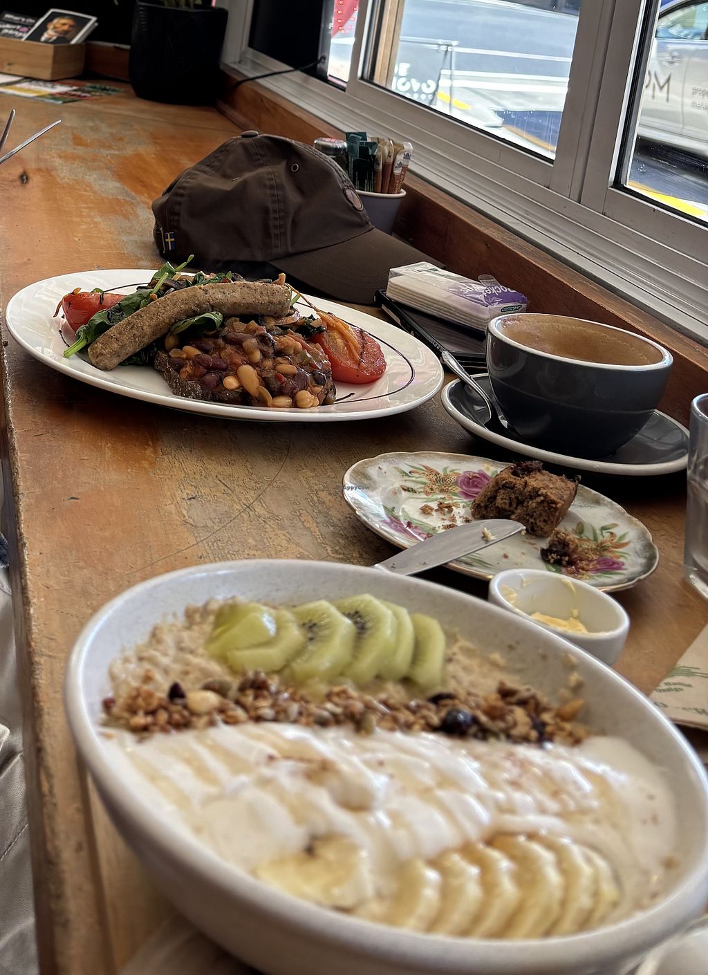 We had a big vegan breakfast and the apple crumble porridge and a date cone to share. 😋