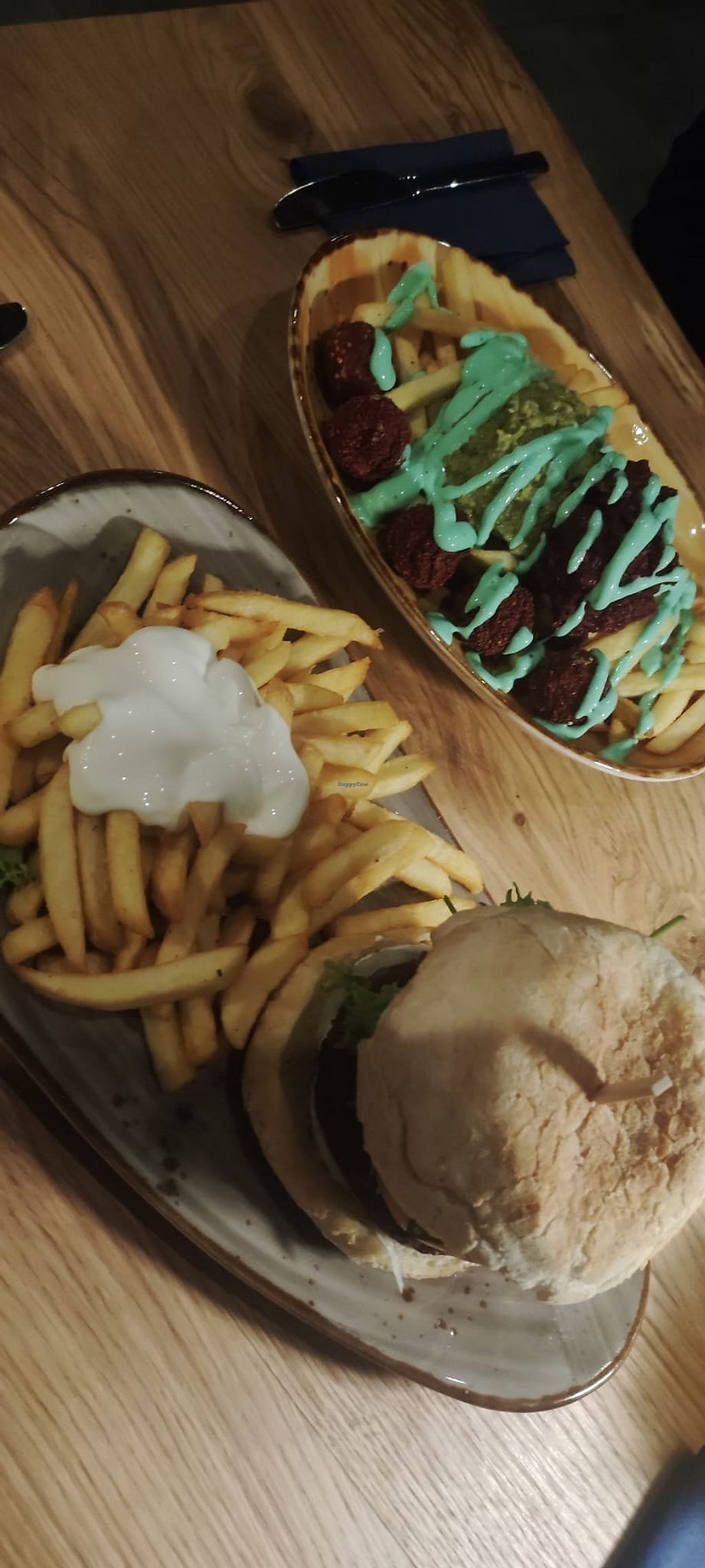 Zudem ist es nicht bloß eine Pommesbude. Ich hatte Falafelpommes. Die Pommes super knusprig und on point frittiert, mit einer türkisen Aioli, grüne Erben-Guacamole und Rote-Beete-Hummus. Dazu Falafelbällchen, ebenso on point frittiert, von innen rot, da mit Rote Beete. Also insgesamt reich an Vitaminen und Proteinen, wo ja in vielen Restaurants bei veganen Alternativen auch nicht so drauf geachtet wird.