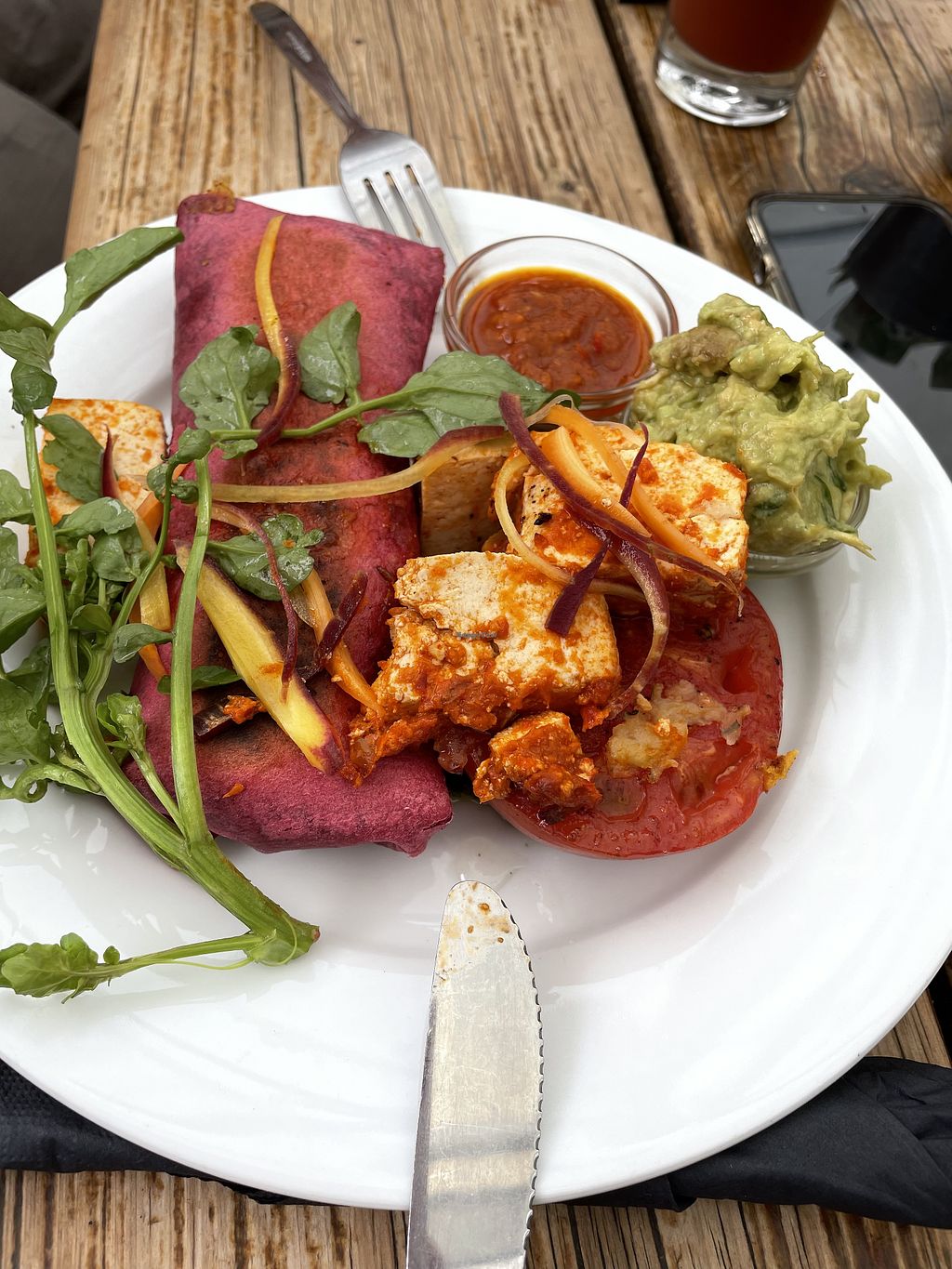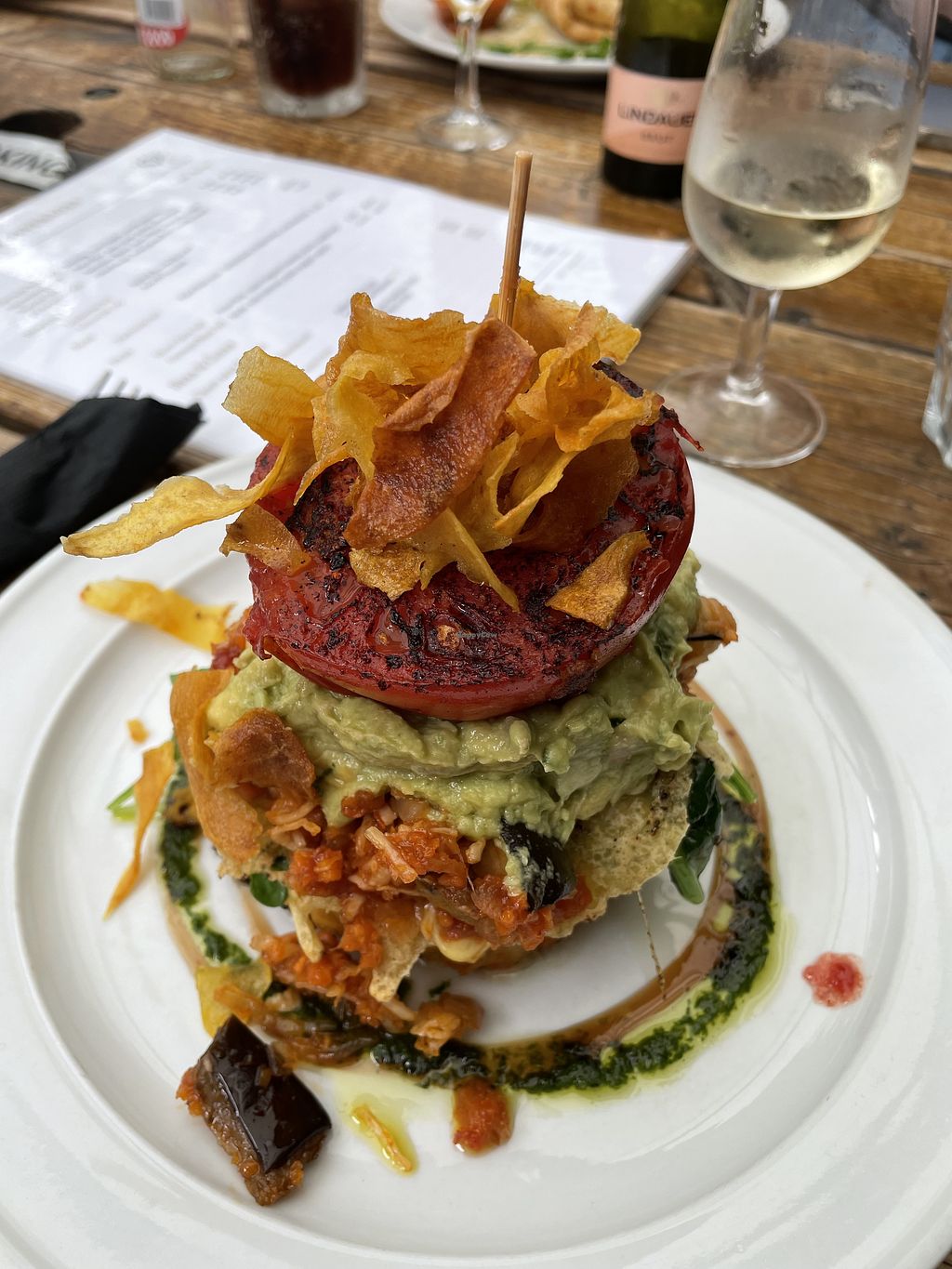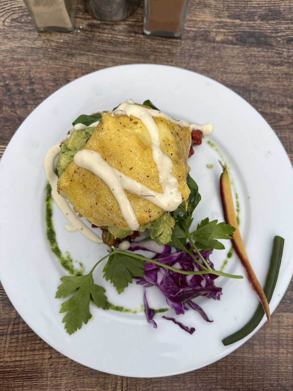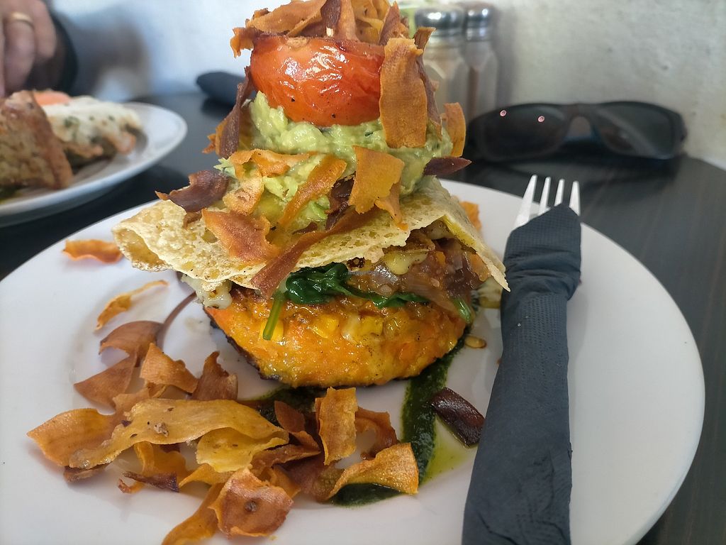 Corn cake with spinach, Avocado, tomatoes and vegan mozzarella