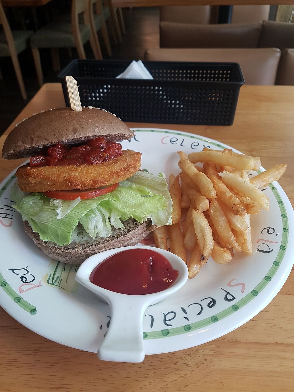 I had the "pork" salsa burger with fries and an oat caramel latte. The coffee is quite expensive, but bit of a treat to have oat milk as I haven't seen it anywhere else yet. Burger was really good. I wouldn't recommend if you don't like fake meats! But for me was really great to have more "western" style food as a treat. Service was great as well (order and pay at the counter first). Has a range of cakes, some of which are vegan, and there is a code in the menu to show what contains milk / eggs etc too!